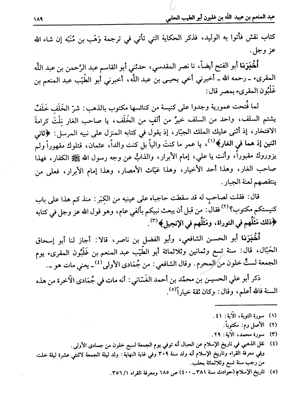 كتاب نقش فاتوا به الوليد فذكر الحكاية التي تأتي في ترجمة وهب بن منبة إن شاء الله عز وجل اخبرنا أبو الفتح ايضا نا نصر المقدسي حدثني أبو القاسم عبد الرحمن بن عبد الله المقرئ رحمه الله اخبرني أخي يحيى بن عبد الله أخبرني أبو الطيب عبد المنعم بن غلبون المقرئ بمصر قال لما فتحت عمورية وجدوا على كنيسة من كنائسها مكتوب بالذهب شر الخلف خلف يشتم السلف واحد من السلف خير من ألف من الخلف يا صاحب الغار نلت كرامة الافتخار إذ أثنى عليك الملك الجبار إذ يقول في كتابة المنزل على نبيه المرسل " ثاني اثنين إذ هما في الغار " (1) يا عمر ما كنت واليا بل كنت والدا عثمان قتلوك مقهورا ولم يزوروك مقبورا وأنت يا علي إمام الإبرار والذاب عن وجه رسول الله (صلى الله عليه وسلم) الكفار فهذا صاحب الغار وهذا أحد الأخيار وهذا غياث الأمصار وهذا إمام الأبرار فعلى من ينتقصهم لعنة الجبار قال فقلت لصاحب له قد سقطت حاجباه على عينيه من الكبر منذ كم هذا على باب كنيستكم مكتوب (2) فقال من قبل أن يبعث نبيكم بألفي عام وهو قول الله عز وجل في كتابة " ذلك مثلهم في التوراة ومثلهم في الإنجيل " (3) أخبرنا أبو الحسن الشافعي وابو الفضل بن ناصر قالا أجاز لنا أبو إسحاق الحبال قال سنة تسع وثمانين وثلاثمائة أبو الطيب عبد المنعم بن غلبون المقرئ يوم الجمعة لست خلون من المحرم وقال الشافعي من جمادى الأولى (4) يعني مات هو ذكر أبو علي الحسين بن محمد بن احمد الغساني أنه مات في جمادى الآخرة من هذه السنة فالله أعلم وقال وكان ثقة خيارا (5)