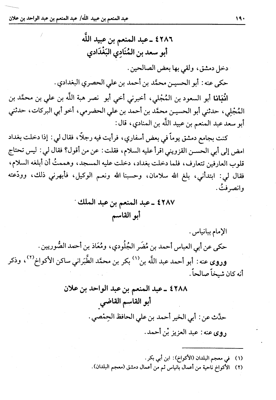 4287 - عبد المنعم بن عبد الملك أبو القاسم الإمام ببانياس حكى عن أبي العباس أحمد بن مضر الجلودي ومعاذ بن احمد الصوريين وروى عنه أبو أحمد عبد الله بن (1) بكر بن محمد الطبراني ساكن الأكواخ (2) وذكر أنه كان شيخا صالحا