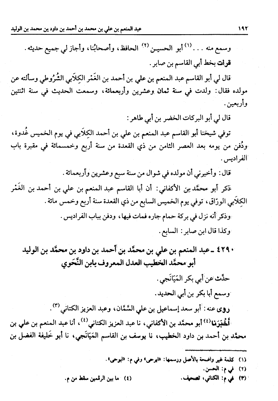 4290 - عبد المنعم بن علي بن محمد بن احمد بن داود بن محمد بن الوليد أبو محمد الخطيب العدل المعروف بابن النحوي حدث عن أبي بكر الميانجي وسمع أبا بكر بن أبي الحديد روى عنه أبو سعد إسماعيل بن علي السمان وعبد العزيز الكتاني (3) اخبرنا (4) أبو محمد بن الأكفاني نا عبد الكتاني أنا عبد المنعم بن علي بن محمد بن أحمد بن داود الخطيب نا يوسف بن القاسم الميانجي نا أبو خليفة الفضل بن