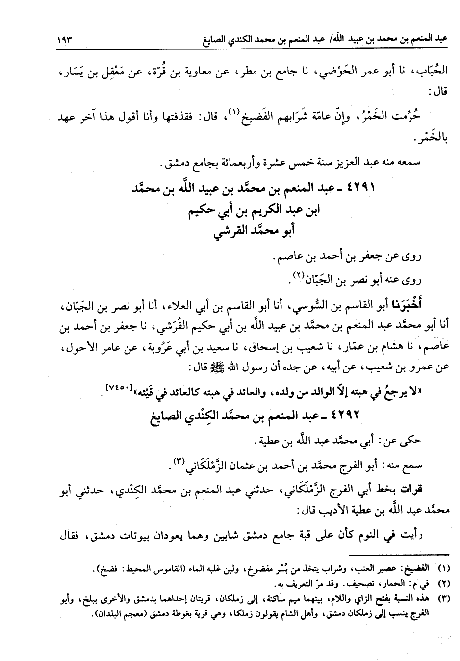 4292 - عبد المنعم بن محمد الكندي الصايغ حكى عن أبي محمد عبد الله بن عطية سمع منه أبو الفرج محمد بن احمد بن عثمان الزملكاني (3) قرأت بخط ابي الفرج الزملكاني حدثني عبد المنعم بن محمد الكندي حدثني أبو محمد عبد الله بن عطية الأديب قال رأيت في النوم كأن على قبة جامع دمشق شابين وهما يعودان بيونات دمشق فقال