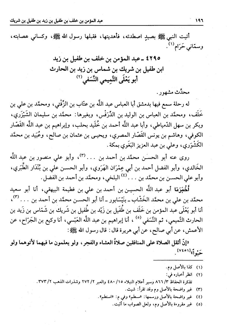 4295 - عبد المؤمن بن خلف بن طفيل بن زيد ابن طفيل بن شريك بن شماس بن زيد بن الحارث أبو يعلى التميمي النسفي (2) محدث مشهور له رحلة سمع فيها بدمشق أبا العباس عبد الله بن عتاب بن الزفتي ومحمد بن علي بن خلف ومحمد بن العباس بن الوليد بن الدرفس وبغيرها محمد بن سليمان الشيزري وبكر بن سهل الدمياطي وأبا عبد الله أحمد بن خليد بحلب وإبراهيم بن عبد الله القصار الكوفي وهاشم بن يونس القصار المصري ويحيى بن عثمان بن صالح وعبيد بن محمد الكشوري وعلي بن عبد العزيز البغوي بمكة روى عنه أبو الحسن محمد بن احمد بن (3) وأبو علي منصور بن عبد الله الخالدي وابو الفضل أحمد بن أبي عمران الهروي وأبو الحسن علي بن بندار الطبري وأبو علي الحسن بن محمد بن (4) البلخي ومحمد بن أحمد بن الفضل اخبرنا أبو عبد الله الحسين بن احمد بن علي بن فطيمة البيهقي أنا أبو سعيد محمد بن علي بن محمد الخشاب بنيسابور انا أبو الحسن محمد بن أحمد بن (3) أنا أبو يعلى عبد المؤمن بن خلف بن طفيل بن زيد بن طفيل بن شريك بن شماس بن زيد بن الحارث التميمي ثم النسفي (5) أنا إبراهيم بن عبد الله العبسي أنا وكيع بن الجراح عن الأعمش عن ابي صالح عن أبي هريرة قال قال رسول الله (صلى الله عليه وسلم) إن أثقل الصلاة على المنافقين صلاة العشاء والفجر ولو يعلمون ما فيهما لأتوهما ولو حبوا