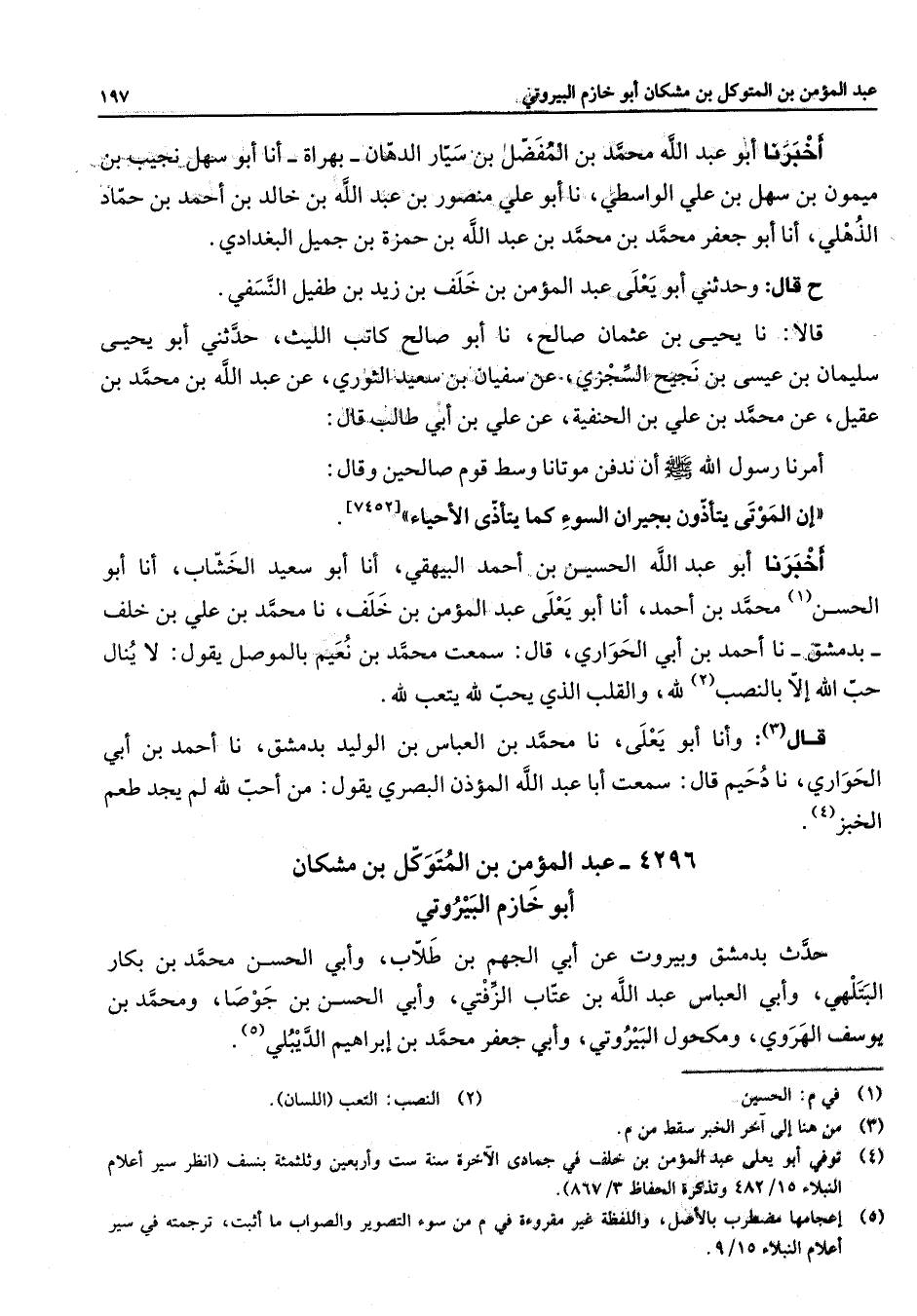 4296 - عبد المؤمن بن المتوكل بن مشكان أبو خازم البيروتي حدث بدمشق وبيروت عن ابي الجهم بن طلاب وأبي الحسن محمد بن بكار الباسهي وأبي العباس عبد الله بن عتاب الزفتي وأبي الحسن بن جوصا ومحمد بن يوسف الهروي ومكحول البيروتي وأبي جعفر محمد بن إبراهيم ألديبلي (5)