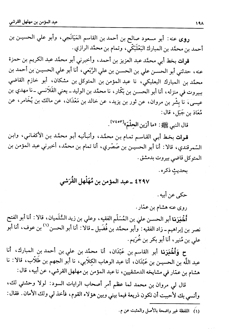 4297 - عبد المؤمن بن مهلهل القرشي حكى عن أبيه روى عنه هشام بن عمار أخبرنا أبو الحسن علي بن المسلم الفقية وعلي بن زيد السلميان قالا أنا أبو الفتح نصر بن إبراهيم زاد الفقية وأبو محمد بن فضيل قالا أنا أبو الحسن (1) بن عوف أنا أبو علي بن منير أنا أبو بكر بن خريم ح وأخبرنا أبو القاسم بن عبدان أنا محمد بن علي بن أحمد بن المبارك أنا عبد الله بن الحسين بن عبدان أنا عبد الوهاب الكلابي نا أبو الجهم بن طلاب قالا نا هشام بن عمار في مشايخه الدمشقيين نا عبد المؤمن بن مهلهل القرشي عن أبيه قال قال لي مروان بن محمد لما عظم أمر أصحاب الرايات السود لولا وحشتي لك وأنسي بك لأحببت أن تكون ذريعة فميا بيني وبين هؤلاء القوم فاخذ لي ولك الأمان فقال