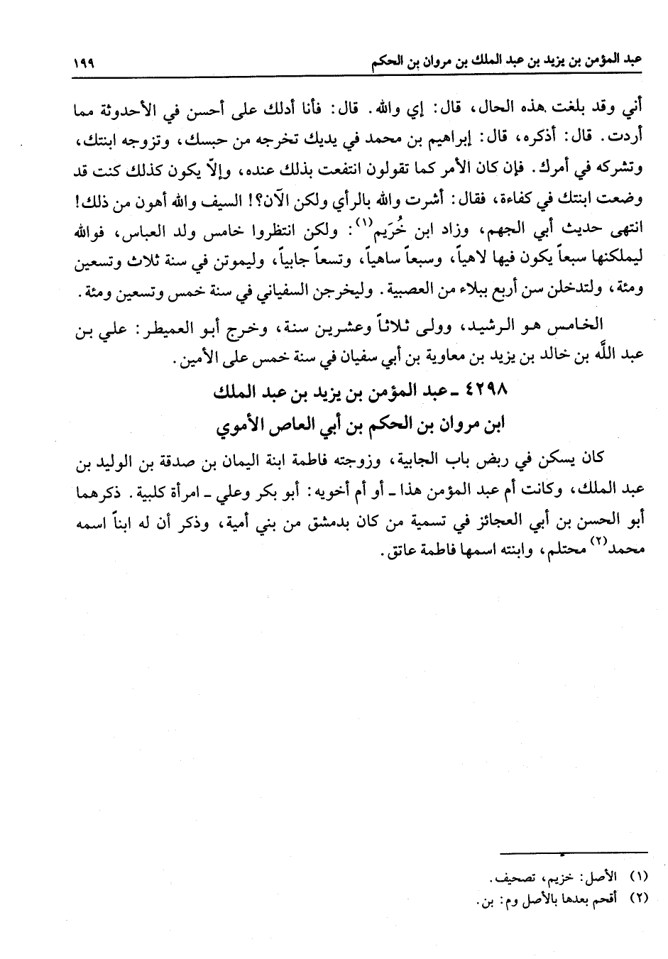 4298 - عبد المؤمن بن يزيد بن عبد الملك ابن مروان بن الحكم بن أبي العاص الأموي كان يسكن في ربض باب الجابية وزوجته فاطمة ابنه اليمان بن صدقة بن الوليد بن عبد الملك وكانت ام عبد المؤمن هذا أو أم أخويه أبو بكر وعلي امرأة كلبية ذكرهما أبو الحسن بن ابي العجائز في تسمية من كان بدمشق من بني أمية وذكر أن له ابنا اسمه محمد (2) محتلم وابنته اسمها فاطمة عاتق