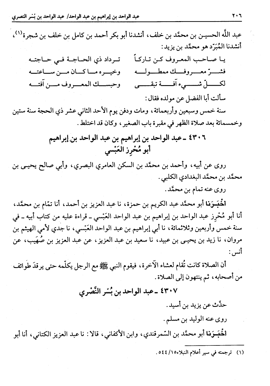4306 - عبد الواحد بن إبراهيم بن عبد الواحد بن إبراهيم أبو محرز العبسي روى عن ابيه واحمد بن محمد بن السكن العامري البصري وأبي صالح يحيى بن محمد بن محمد البغدادي الكلبي روى عنه تمام بن محمد اخبرنا أبو محمد عبد الكريم بن حمزة نا عبد العزيز بن أحمد أنا تمام بن محمد أنا أبو محرز عبد الواحد بن إبراهيم بن عبد الواحد العبسي قراءة عليه كتاب أبيه في سنة خمس وأربعين وثلاثمائة نا أبي إبراهيم بن عبد الواحد العبسي نا جدي لأمي الهيثم بن مروان نا زيد بن يحيى بن عبيد نا سعيد بن عبد العزيز عن عبد العزيز بن صهيب عن أنس أن الصلاة كانت تقام لعشاء الآخرة فيقوم النبي (صلى الله عليه وسلم) مع الرجل يكلمه حتى يرقد طوائف من أصحابه ثم ينتهون إلى الصلاة
