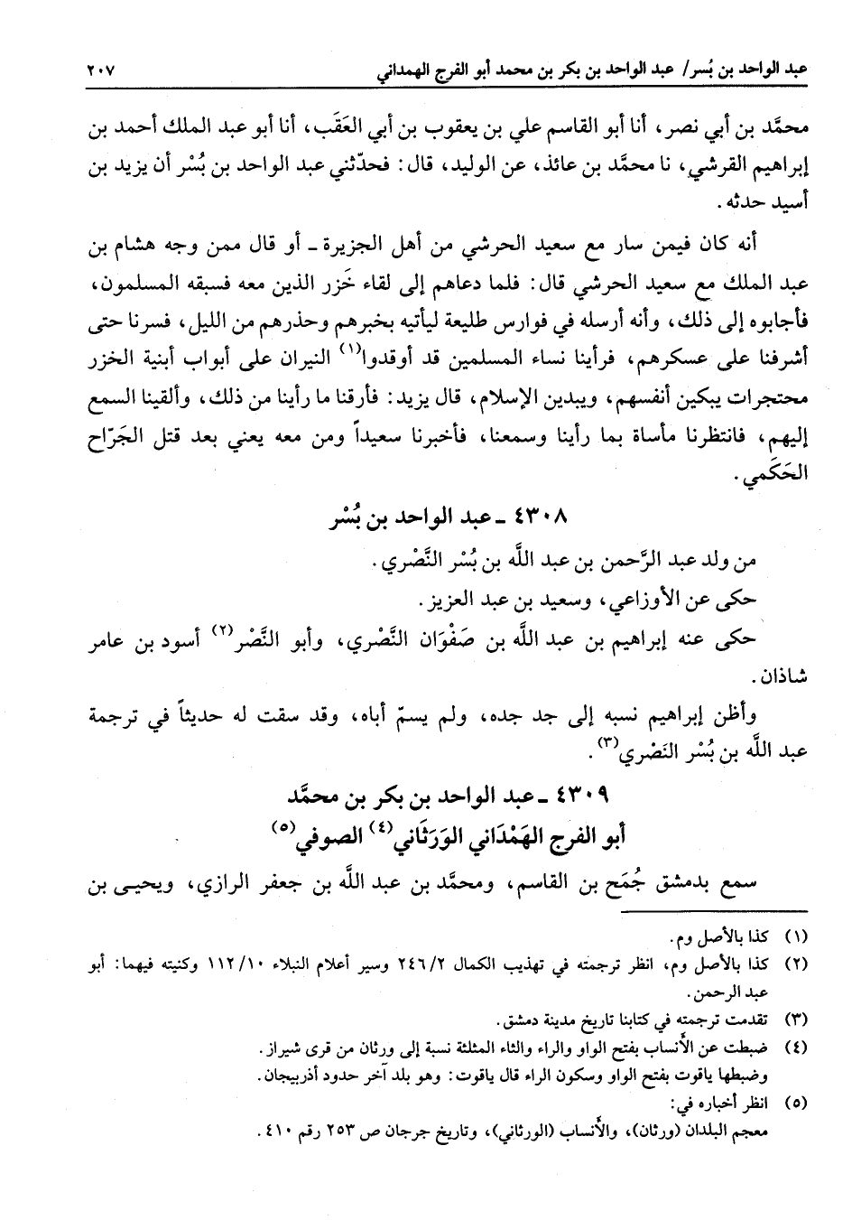 4309 - عبد الواحد بن بكر بن محمد أبو الفرج الهمداني الورثاني (4) الصوفي (5) سمع بدمشق جمح بن القاسم ومحمد بن عبد الله بن جعفر الرازي ويحيى بن