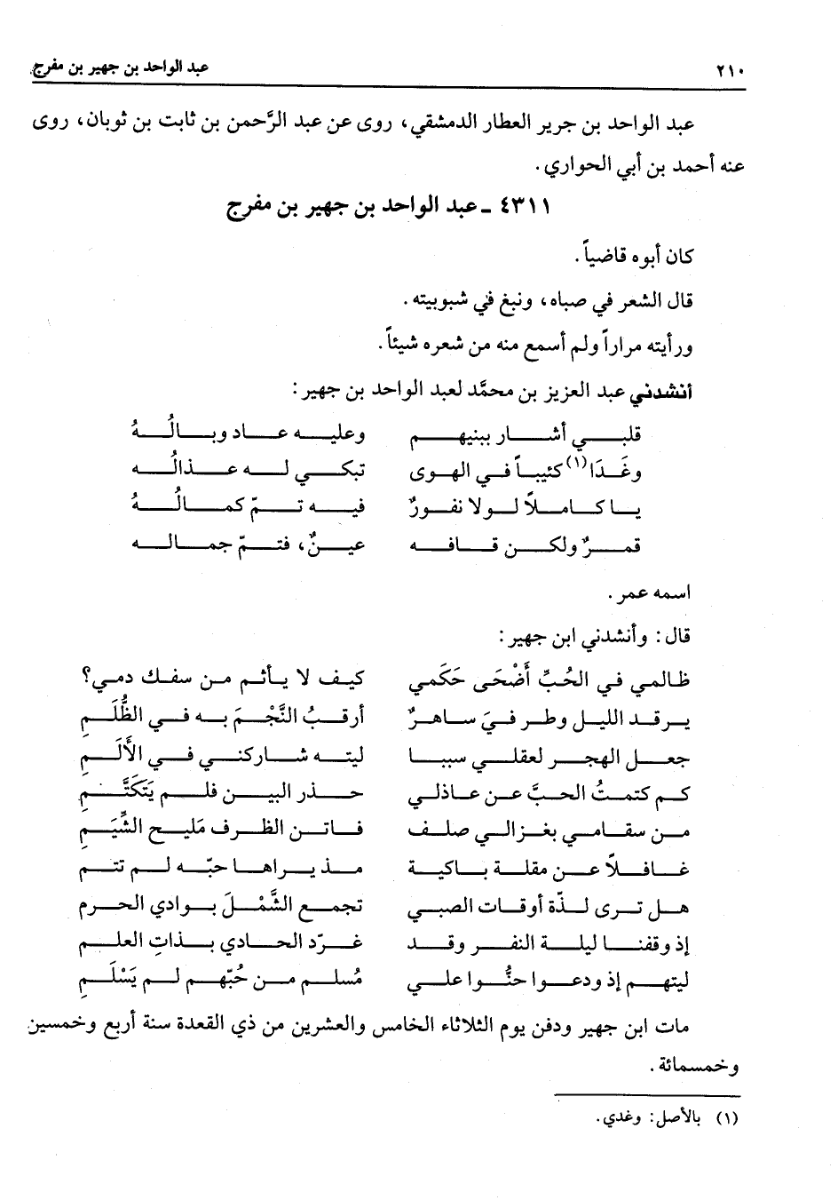 4311 - عبد الواحد بن جهير بن مفرج كان أبوه قاضيا قال الشعر في صباه ونبغ في شبوبيته ورأيته مرارا ولم أسمع منه من شعره شيئا أنشدني عبد العزيز بن محمد لعبد الواحد بن جهير * قلبي أشار بينهم * وعليه عاد وباله وغدا (1) كئيبا في الهوى * تبكي له عذاله يا كاملا لولا نفور * فيه تم كماله قمر ولكن قافة * عين فتم جمالة * اسمه عمر قال وانشدني ابن جهير * ظالمي في الحب أضحى حكمي * كيف لا يأثم من سفك دمي يرقد الليل وطرفي ساهر * أرقب النجم به في الظلم جعل الهجر لعقلي سببا * ليته شاركني في الألم كم كتمت الحب عن عاذلي حذر البين فلم يتكتم من سقامي بغزالي صلف * فاتن الظرف مليح الشيم غافلا عن مقلة باكية * مذ يراها حبه لم تتم هل ترى لذة أوقات الصبي تجمع بوادي الحرم * إذ وقفنا ليلة النفر وقد غرد الحادي بذات العلم * ليتهم إذ ودعوا حنوا علي * مسلم من حبهم لم يسلم * مات ابن جهير ودفن يوم الثلاثاء الخامس والعشرين من ذي العقدة سنة أربع وخمسين وخمسمائة