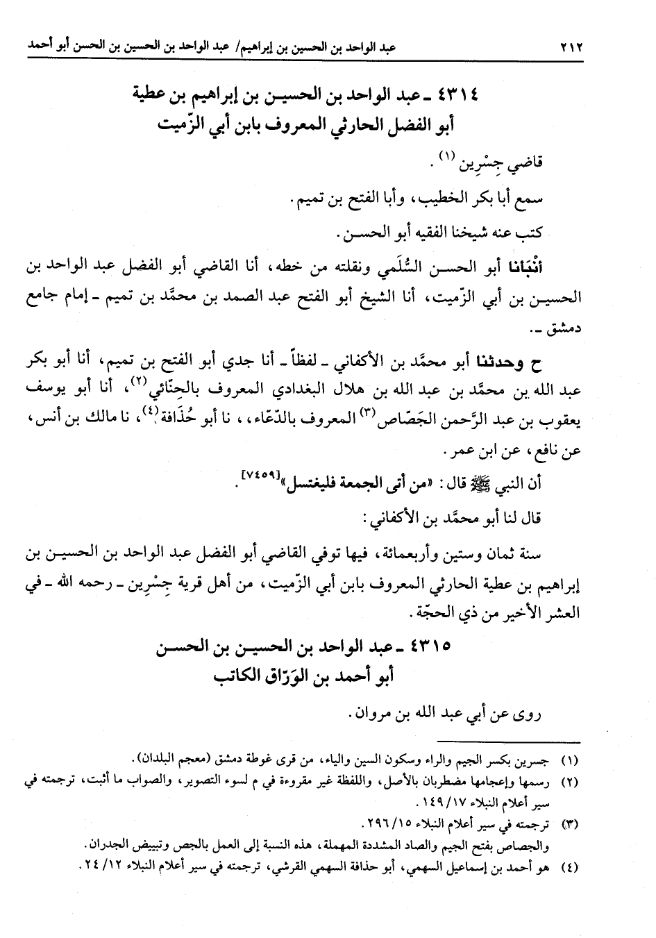 4314 - عبد الواحد بن الحسين بن إبراهيم بن عطية أبو الفضل الحارثي المعروف بابن أبي الزميت قاضي جسرين (1) سمع أبا بكر الخطيب وأبا الفتح بن تميم كتب عنه شيخنا الفقية أبو الحسن أنبأنا أبو الحسن السلمي ونقلته من خطته انا القاضي أبو الفضل عبد الواحد بن الحسين بن أبي الزميت انا الشيخ أبو الفتح عبد الصمد بن محمد بن تميم إمام جامع دمشق ح وحدثنا أبو محمد بن الأكفاني لفظا أنا جدي أبو الفتح بن تميم أنا أبو بكر عبد الله بن محمد بن عبد الله بن هلال البغدادي المعروف بالحنائي (2) أنا أبو يوسف يعقوب بن عبد الرحمن الجصاص المعروف بالدعاء نا أبو حذافة (4) نا مالك بن أنس عن نافع عن ابن عمر أن النبي (صلى الله عليه وسلم) قال من أتى الجمعة فليغتسل