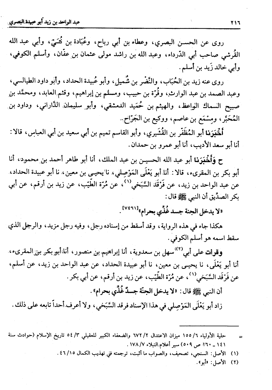 [7461] هكذا جاء في هذة الرواية وقد أسقط من إسناده رجل وفيه رجل مزيد والرجل الذي سقط اسمه هو أسلم الكوفي وقرأت علي أبي (2) سهل بن سعدوية أنا إبراهيم بن منصور أنا أبو بكر بن المقرئ أنا أبو يعلى نا يحيى بن معين نا أبو عبيدة الحداد عن عبد الواحد بن زيد عن أسلم عن فرقد السبخي (1) عن مرة الطيب عن زيد بن ارقم عن ابي بكر أن النبي (صلى الله عليه وسلم) قال لا يدخل الجنة جد غذي بحرام زاد أبو يعلى الموصلي في هذا الإسناد فرقد السبخي ولا أعرف أحدا تابعه على ذلك
