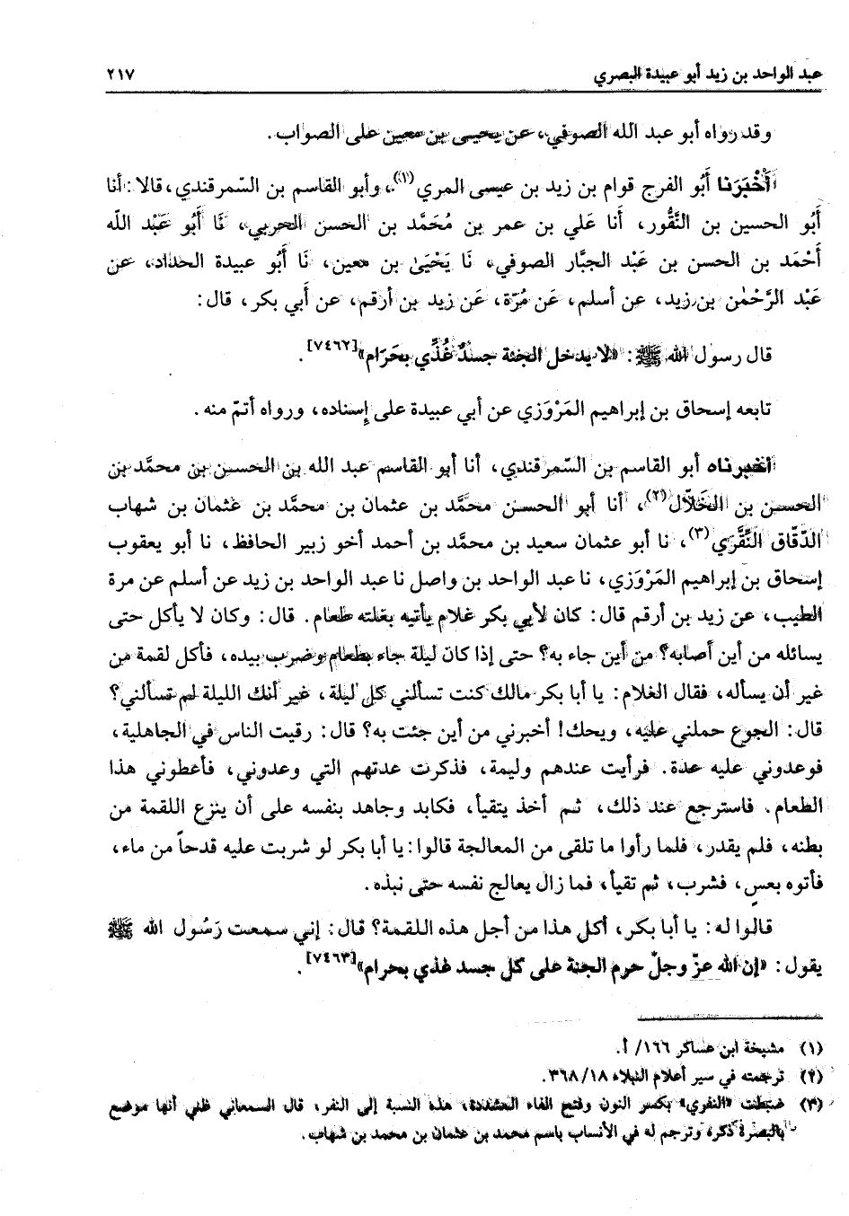 [7462] تابعه إسحاق بن إبراهيم المروزي عن ابي عبيدة على إسناده رواه أتم منه أخبرناه أبو القاسم بن السمرقندي أنا أبو القاسم عبد الله بن الحسن بن محمد بن الحسن بن الخلال (2) أنا أبو الحسن محمد بن عثمان بن محمد بن عثمان بن شهاب الدقاق النقري (3) نا أبو عثمان سعيد بن محمد بن أحمد أخو زبير الحافظ نا أبو يعقوب إسحقاق بن إبراهيم المروزي نا عبد الواحد بن واصل نا عبد الواحد بن زيد عن أسلم عن مرة الطيب عن زيد بن أرقم قال كان لأبي بكر غلام يأتيه بغلته طعام قال وكان لا يأكل حتى يسائله من أين أصابه من أين جاء به حتى إذا كان ليلة جاء بطعام وضرب بيده فاكل لقمة من غير أن يسأله فقال الغلام يا أبا بكر مالك كنت تسألني كل ليلة غير أنك الليلة لم تسألني قال الجوع حملني عليه ويحك اخبرني من اين جئت به قال رقيت الناس في الجاهلية فوعدوني عليه عدة فرايت عندهم وليمة فذكرت عدتهم التي وعدوني فاعطوني هذا الطعام فاسترجع عند ذلك ثم اخذ يتقيأ فكابد وجاهد بنفسه على أن ينزع اللقمة من بطنه فلم يقدر فلما رأوا ما تلقى من المعالجة قالوا يا أبا بكر لو شربت عليه قدحا من ماء فأتوه بعس فشرب ثم تقيأ فما زال يعالج نفسه حتى نبذه قالوا له يا أبا بكر أكل هذا من أجل هذه اللقمة قال إني سمعت رسول الله (صلى الله عليه وسلم) يقول إن الله عز وجل حرم الجنة على كل جسد غذي بحرام