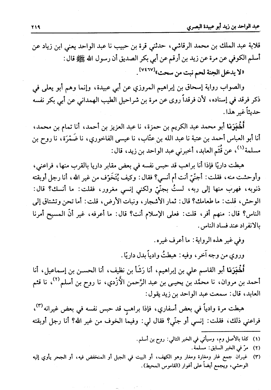 [7467] والصواب رواية إسحاق بن إبراهيم المروزي عن أبي عبيدة وإنما وهم أبو يعلى في ذكر فرقد في إسناده لأن فرقدا روى عن مرة بن شراحيل الطيب الهمداني عن أبي بكر نفسه حديثا غير هذا أخبرنا أبو محمد عبد الكريم بن حمزة نا عبد العزيز بن احمد أنا تمام بن محمد أنا أبو العباس بن عتبة نا عبد الله بن عتاب نا عيسى الفاخوري نا ضمرة نا روح بن مسلمة (1) عن قثم العابد أخبرني عبد الواحد بن زيد قال هبطت داريا فإذا أنا براهب قد حبس نفسه في بعض مقابر داريا بالقرب منها فراعني وأوحشت منه فقلت أجني أنت أم أنسي فقال وكيف يتخوف من غير الله أنا رجل أوبقة ذنوبه فهرب منها ألى ربه لست بجني ولكني إنسي مغرور فقلت ما أنسك قال الوحش قلت ما طعامك قال ثمار الأشجار ونبات الأرض قلت أما تحن وتشتاق إلى الناس قال منهم أفر قلت فعلى الإسلام أنت قال ما أعرفه غير ان المسيح أمرنا بالانفراد عند فساد الناس وفي غير هذه الرواية ما أعرف غيره وروي من وجه آخر وفيه هبطت واديا بدل داريا أخبرنا أبو القاسم علي بن إبراهيم أنا رشا بن نظيف أنا الحسن بن إسماعيل أنا أحمد بن مروان نا محمد بن يحيى بن عبد الرحمن الأزدي نا روح بن أسلم (2) نا قثم العابد قال سمعت عبد الواحد بن زيد يقول هبطت مرة واديا في بعض أسفاري فإذا براهب قد حبس نفسه في بعض غير انه (3) فراعني ذلك فقلت إنسي أو جني فقال لي وفيما الخوف من غير الله أنا رجل أوبقته