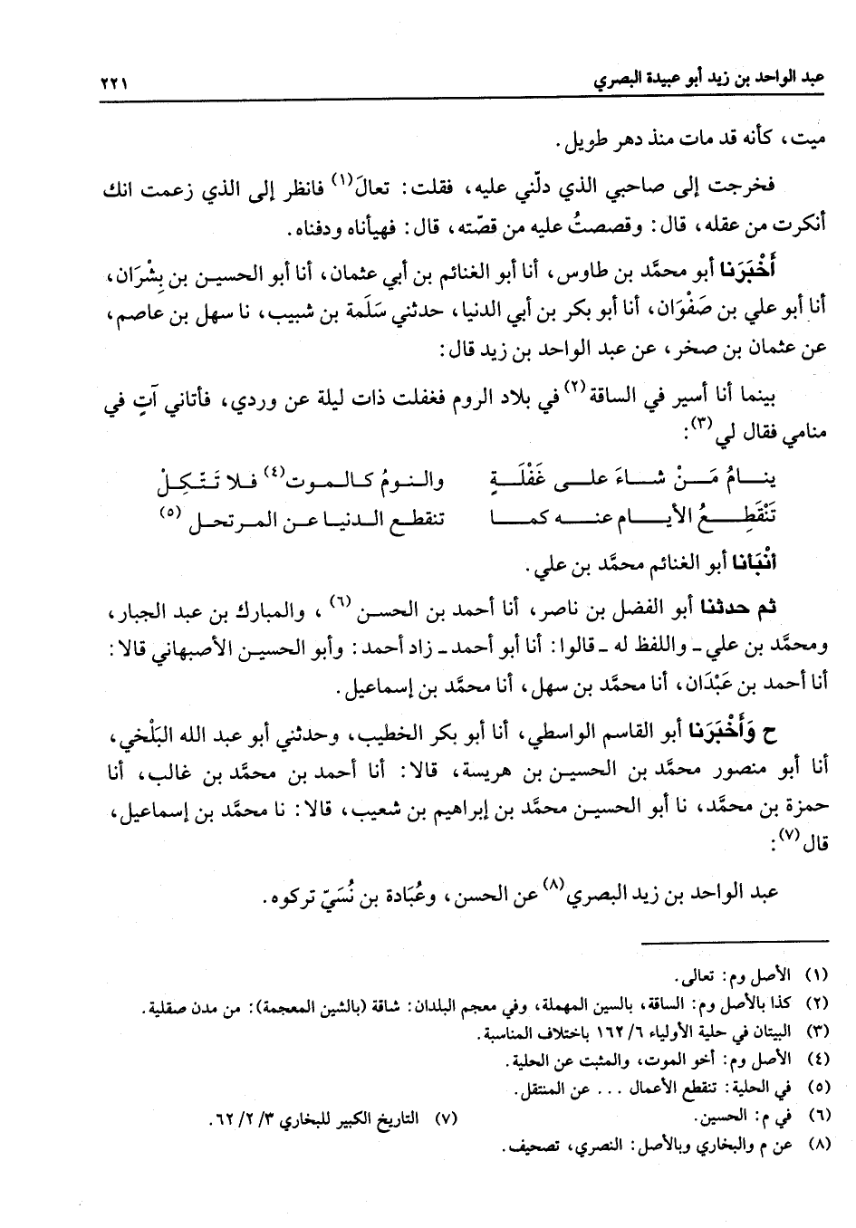ميت كأنه قد مات منذ دهر طويل فخرجت إلى صاحبي الذي دلني عليه فقلت تعال (1) فانظر الى الذي زعمت أنك انكرت من عقله قال وقصصت عليه من قصته قال فهيأناه ودفناه أخبرنا أبو محمد بن طاوس أنا أبو الغنائم بن ابي عثمان أنا أبو الحسين بن بشران أنا أبو علي بن صفوان أنا أبو بكر بن أبي الدنيا حدثني سلمة بن شبيب نا سهل بن عاصم عن عثمان بن صخر عن عبد الواحد بن زيد قال بينما أنا أسير في الساقة (2) في بلاد الروم فغفلت ذات ليلة عن وردي فأتاني آت في منامي فقال لي (3) * ينام من شاء على غفلة * والنوم كالموت (4) فلا تتكل تنقطع الأيام عنه كما * تنقطع الدنيا عن المرتحل (5) * أنبأنا أبو الغنائم محمد بن علي ثم حدثنا أبو الفضل بن ناصر أنا أحمد بن الحسن (6) والمبارك بن عبد الجبار ومحمد بن علي واللفظ له قالوا أنا أبو أحمد زاد أحمد وابو الحسين الأصبهاني قالا أنا أحمد بن عبدان أنا محمد بن سهل أنا محمد بن إسماعيل ح وأخبرنا أبو القاسم الواسطي أنا أبو بكر الخطيب وحدثني أبو عبد الله البلخي أنا أبو منصور محمد بن الحسين بن هريسة قالا أنا أحمد بن محمد بن غالب أنا حمزة بن محمد نا أبو الحسين محمد بن إبراهيم بن شعيب قالا نا محمد بن إسماعيل قال (7) * عبد الواحد بن زيد البصري (8) * عن الحسن وعبادة بن نسي تركوه *