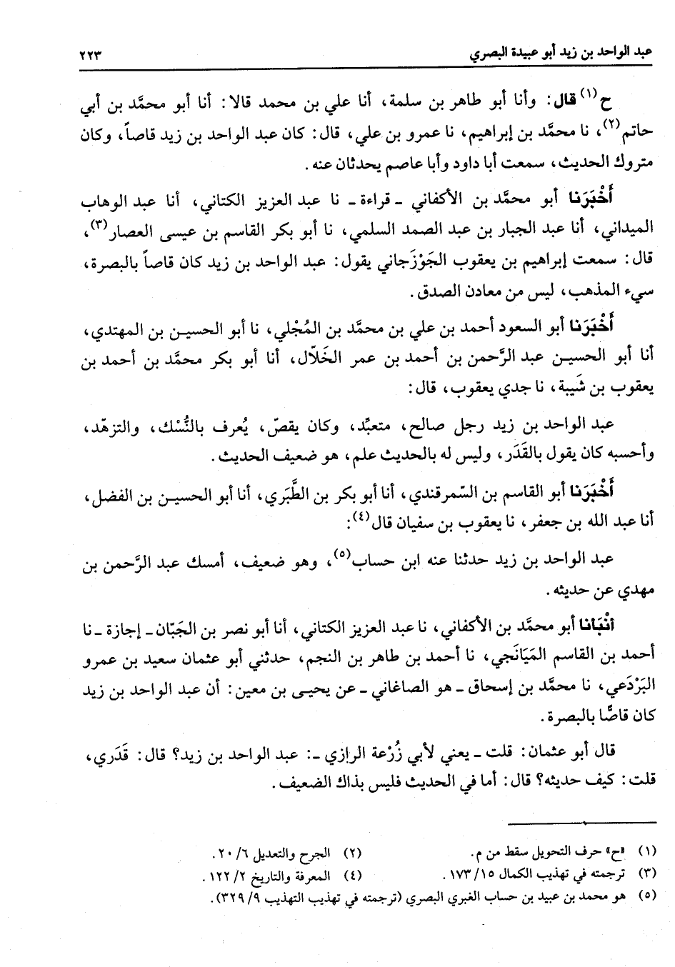 ح (1) قال وانا أبو طاهر بن سلمة أنا علي بن محمد قالا أنا أبو محمد بن أبي حاتم (2) نا محمد بن إبراهيم نا عمرو بن علي قال كان عبد الواحد بن زيد قاصا وكان متروك الحديث سمعت أبا داود وأبا عاصم يحدثان عنه أخبرنا أبو محمد بن الأكفاني قراءة نا عبد العزيز الكتاني أنا عبد الوهاب الميداني أنا عبد الجبار بن عبد الصمد السلمي نا أبو بكر القاسم بن عيسى العصار (3) قال سمعت إبراهيم بن يعقوب الجوزجاني يقول عبد الواحد بن زيد كان قاصا بالبصرة سئ المذهب ليس من معادن الصدق أخبرنا أبو السعود أحمد بن علي بن محمد بن المجلي نا أبو الحسين بن المهتدي أنا أبو الحسين عبد الرحمن بن احمد بن عمر الخلال أنا أبو بكر محمد بن أحمد بن يعقوب بن شيبة نا جدي يعقوب قال عبد الواحد بن زيد رجل صالح متعبد وكان يقص يعرف بالنسك والتزهد واحسبه كان يقول بالقدر وليس له بالحديث علم هو ضعيف الحديث أخبرنا أبو القاسم بن السمرقندي أنا أبو بكر بن الطبري أنا أبو الحسين بن الفضل أنا عبد الله بن جعفر نا يعقوب بن سفيان قال (4) عبد الواحد بن زيد حدثنا عنه ابن حساب (5) وهو ضعيف امسك عبد الرحمن بن مهدي عن حديثه أنبأنا أبو محمد بن الأكفاني نا عبد العزيز الكتاني أنا أبو نصر بن الجبان اجازة نا احمد بن القاسم الميانجي نا أحمد بن طاهر بن النجم حدثني أبو عثمان سعيد بن عمرو البردعي نا محمد بن إسحاق هو الصاغاني عن يحيى بن معين ان عبد الواحد بن زيد كان قاصا بالبصرة قال أبو عثمان قلت يعني لأبي زرعة الرازي عبد الواحد بن زيد قال قدري قلت كيف حديثه قال أما في الحديث فليس بذاك الضعيف