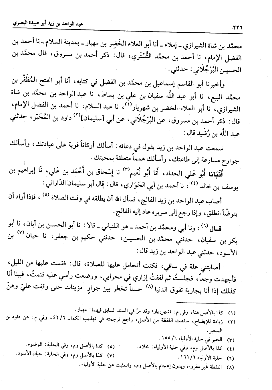 محمد بن شاة الشيرازي إملاء أنا أبو العلاء الخضر بن مهيار بمدينة السلام نا أحمد بن الفضل الإمام نا أحمد بن محمد التستري قال ذكر احمد بن مسروق قال محمد بن الحسين البرجلاني حدثني وأخبرنا أبو القاسم إسماعيل بن محمد بن الفضل في كتابة أنا أبو الفتح المظفر بن محمد البيع نا أبو عبد الله سفيان بن علي بن بساط نا عبد الواحد بن محمد بن شاة الشيرازي نا أبو العلاء الخضر بن شهريار (1) نا عبد السلام نا احمد بن الفضل الإمام قال ذكر أحمد بن مسروق عن البرجلاني عن أبي سليمان (2) داود بن المحبر حدثني عبد الله بن رشيد قال سمعت عبد الواحد بن زيد يقول في دعائه أسألك أركانا قوية على عبادتك وأسألك جوارح مسارعة إلى طاعتك وأسألك هما متعلقة بمحبتك أنبأنا أبو علي الحداد أنا أبو نعيم (3) نا إسحاق بن أحمد بن علي نا إبراهيم بن يوسف بن خالد (4) نا أحمد بن ابي الحواري قال قال أبو سليمان الداراني أصاب عبد الواحد بن زيد الفالج فسأل الله أن يطلقه في وقت الصلاة (5) فإذا أراد أن يتوضا أنطلق وإذا رجع إلى سريره عاد إليه الفالج قال (6) ونا أبي ومحمد بن أحمد هو اللنباني قالا نا أبو الحسن بن أبان نا أبو بكر بن سفيان حدثني محمد بن الحسين حدثني حكيم بن جعفر نا حبان (7) بن الأسود حدثني عبد الواحد بن زيد قال أصابتني علة في ساقي فكنت أتحامل عليه للصلاة قال فقمت عليها من الليل فاجهدت وجعا فجلست ثم لففت إزاري في محرابي ووضعت رأسي عليه فنمت فبينا أنا كذلك إذا أنا بجارية تفوق الدنيا (8) حسنا تخطر بين جوار مزينات حتى وقفت علي وهن