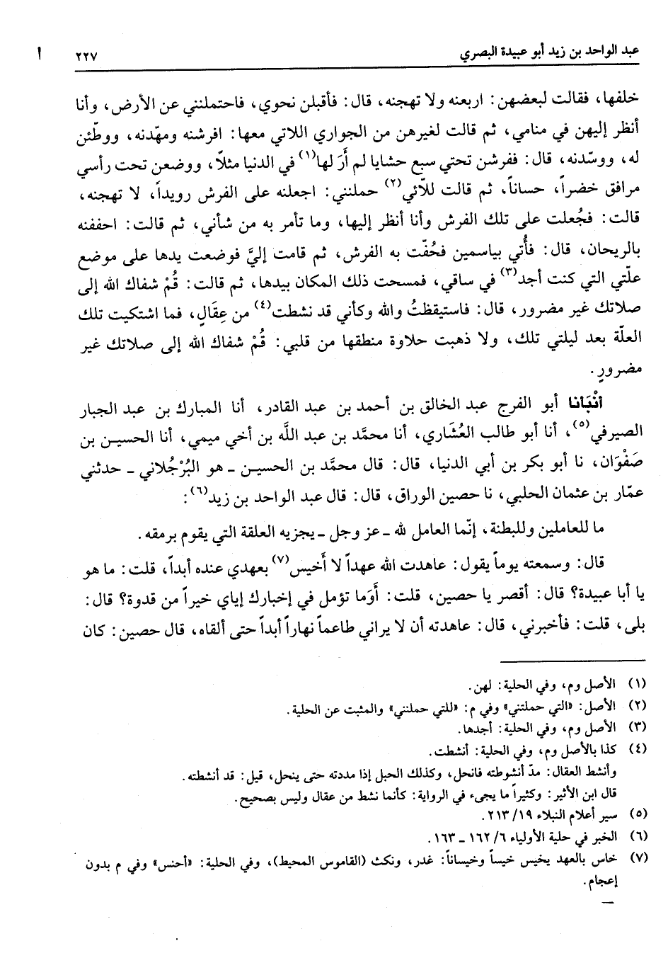 خلفها فقالت لبعضهن أربعنه ولا تهجنه قال فأقبلن نحوي فاحتملنني عن الأرض وأنا أنظر إليهن في منامي ثم قالت لغيرهن من الجواري اللاتي معها افرشنة ومهدنه ووطئن له ووسدنه قال ففرشن تحتي سبع حشايا لم أر لها (1) في الدنيا مثلا ووضعن تحت رأسي مرافق خضرا حسانا ثم قالت للائي (2) حملنني اجعلنه على الفرش رويدا لا تهجنه قالت فجعلت على تلك الفرش وانا انظر إليها وما تأمر به من شأني ثم قالت احففنه بالريحان قال فأتي بياسمين فحفت به الفرش ثم قامت إلى فوضعت يدها على موضع علتي التي كنت أجد (3) في ساقي فمسحت ذلك المكان بيدها ثم قالت قم شفاك الله إلى صلاتك غير مضرور قال فاستيقطت والله وكاني قد نشطت من عقال فما اشتكيت تلك العلة بعد ليلتي تلك ولا ذهبت حلاوة منطقها من قلبي قم شفاك الله إلى صلاتك غير مضرور أنبأنا أبو الفرج عبد الخالق بن أحمد بن عبد القادر أنا المبارك بن عبد الجبار الصيرفي (5) أنا أبو طالب العشاري أنا محمد بن عبد الله بن اخي ميمي أنا الحسين بن صفوان نا أبو بكر بن أبي الدنيا قال قال محمد بن الحسين هو البرجلاني حدثني عمار بن عثمان الحلبي نا حصين الوراق قال قال عبد الواحد بن زيد (6) ما للعاملين وللبطنة إنما العامل لله عز وجل يجزية العلقة التي يقوم برمقه قال وسمعته يوما يقول عاهدت الله عهدا لا أخيس بعهدي عنده أبدا قلت ما هو يا أبا عبيدة قال اقصر يا حصين قلت أوما تؤمل في إخبارك إياي خيرا من قدوة قال بلى قلت فأخبرني قال عاهدته أن لا يراني طاعما نهارا أبدا حتى ألقاه قال حصين كان