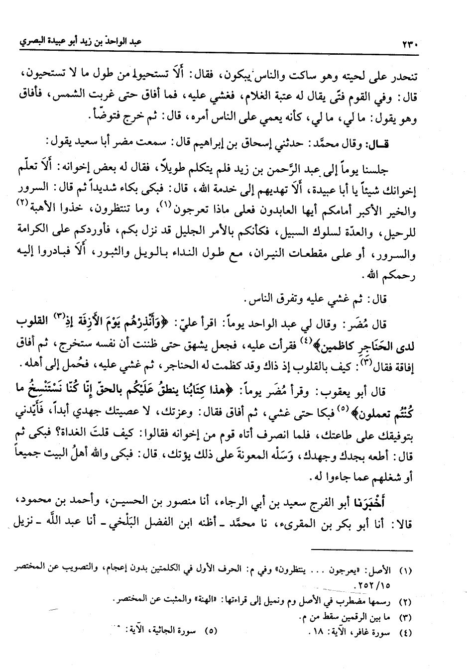 تنحدر على لحيته وهو ساكت والناس يبكون فقال الا تستحيوا من طول ما لا تستحيون قال وفي القوم فتى يقال له عتبة الغلام فغشي عليه فما افاق حتى غربت الشمس فأفاق وهو يقول ما لي ما لي كأنه يعمي على الناس امره قال ثم خرج فتوضأ قال وقال محمد حدثني اسحاق بن ابراهيم قال سمعت مضر ابا سعيد يقول جلسنا يوما الى عبد الرحمن بن زيد فلم يتكلم طويلا فقال له بعض اخوانه الا تعلم اخوانك شيئا يا ابا عبيدة الا تهديهم الى خدمة الله قال فبكى بكاء شديدا ثم قال السرور والخير الاكبر امامكم ايها العابدون فعلى ماذا تعرجون (1) وما تنظرون خذوا الاهبة (2) للرحيل والعدة لسلوك السبيل فكأنكم بالامر الجليل قد نزل بكم فأوردكم على الكرامة والسرور أو على مقطعات النيران مع طول النداء بالويل والثبور ألا فبادروا إليه رحمكم الله قال ثم غشي عليه وتفرق الناس قال مضر وقال لي عبد الواحد يوما اقرأ علي " وانذرهم يوم الأزفة إذ (3) القلوب لدى الحناجر كاظمين " (4) فقرأت عليه فجعل يشهق حتى ظننت ان نفسه ستخرج ثم افاق افاقة فقال (3) كيف بالقلوب إذ ذاك وقد كظمت له الحناجر ثم غشي عليه فحمل الى اهله قال أبو يعقوب وقرأ مضر يوما هذا كتابنا ينطق عليكم بالحق انا كنا نستنسخ ما كنتم تعملون (5) فبكا حتى غشي ثم افاق فقال وعزتك لا عصيتك جهدي ابدا فأيدني بتوفيقك على طاعتك فلما انصرف اتاه قوم من اخوانه فقالوا كيف قلت الغداة فبكى ثم قال اطعه بجدك وجهدك وسله المعونة على ذلك يؤتك قال فبكى والله اهل البيت جميعا أو شغلهم عما جاءوا له أخبرنا أبو الفرج سعيد بن ابي الرجاء انا منصور بن الحسين واحمد بن محمود قالا انا أبو بكر بن المقرئ نا محمد اظنه ابن الفضل البلخي انا عبد الله نزيل