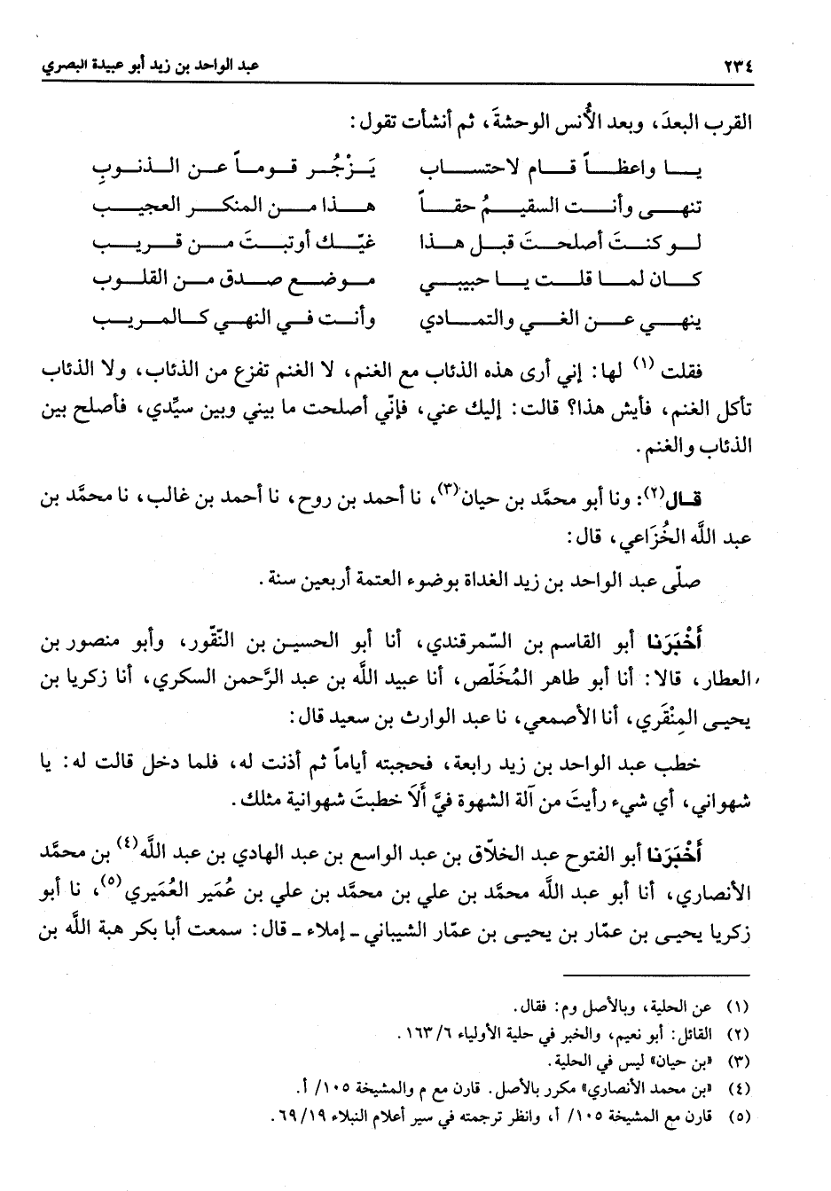 القرب البعد وبعد الأنس الوحشة ثم أنشأت تقول * يا واعظا قام لاحتساب * يزجر قوما عن الذنوب * * تنهى وانت السقيم حقا * هذا من المنكر العجيب لو كنت أصلحت قبل هذا * غيك أو تبت من قريب كان لما قلت يا حبيب * موضع صدق من القلوب ينهي عن الغي والتمادي * وأنت في النهي كالمريب * فقلت (1) لها إني أرى هذه الذئاب مع الغنم لا الغنم تفزع من الذئاب ولا الذئاب تأكل الغنم فأيش هذا قالت إليك عني فإني أصلحت ما بيني وبين سيد فاصلح بين الذئاب والغنم قال (2) ونا أبو محمد بن حيان (3) نا أحمد بن روح نا أحمد بن غالب نا محمد بن عبد الله الخزاعي قال صلى عبد الواحد بن زيد الغداة بوضوء العتمة أربعين سنة أخبرنا أبو القاسم بن السمرقندي أنا أبو الحسين بن النقور وابو منصور بن العطار قالا أنا أبو طاهر المخلص أنا عبيد الله بن عبد الرحمن السكري أنا زكريا بن يحيى المنقرى أنا الأصمعي نا عبد الوراث بن سعيد قال خطب عبد الواحد بن زيد رابعة فحجبته أياما ثم أذنت له فلما دخل قالت له يا شهواني أي شئ رأيت من آل الشهوة ألا خطبت شهوانية مثلك أخبرنا أبو الفتوح عبد الخلاق بن عبد الواسع بن عبد الهادي بن عبد الله (4) بن محمد الأنصاري أنا أبو عبد الله محمد بن علي بن محمد بن علي بن عمير العميري (5) نا أبو زكريا يحيى بن عمار بن يحيى بن عمار الشيباني إملاء قال سمعت أبا بكر هبة الله بن