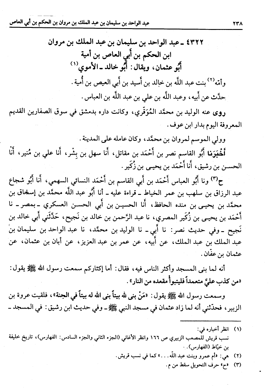 4322 - عبد الواحد بن سليمان بن عبد الملك بن مروان ابن الحكم بن أبي العاص بن امية أبو عثمان ويقال أبو خالد الأموي (1) وأمه (2) بنت عبد الله بن خالد بن أسيد بن أبي العيص بن امية حدث عن ابيه وعبد الله بن علي بن عبد الله بن العباس روى عنه الوليد بن محمد الموقري وكانت داره بدمشق في سوق الصفارين القديم المعروفة اليوم بدار ابن عوف وولي الموسم لمروان بن محمد وكان عامله على المدينة أخبرنا أبو القاسم نصر بن احمد بن مقاتل أنا سهل بن بشر أنا علي بن منير أنا الحسن بن رشيق أنا احمد بن يحيى بن زكير ح (3) ونا أبو العباس احمد بن ابي القاسم بن احمد النسائي السهمي أنا أبو شجاع عبد الرزاق بن سلهب بن عمر الخياط قراءة عليه أنا أبو عبد الله محمد بن إسحاق بن محمد بن يحيى بن مندة الحافظ أنا الحسين بن أبي الحسن العسكري بمصر نا أحمد بن يحيى بن زكير المصري نا عبد الرحمن بن خالد بن نجيح حدثني أبي خالد بن نجيح وفي حديث نصر نا أبي نا الوليد بن محمد نا عبد الواحد بن سليمان بن عبد الملك بن عبد الملك عن أبيه عن عمر بن عبد العزيز عن أبان بن عثمان عن عثمان بن عفان أنه لما بنى المسجد وأكثر الناس فيه فقال أما إكثاركم سمعت رسول الله (صلى الله عليه وسلم) يقول من كذب علي متعمدا فليتبوأ مقعده من النار وسمعت رسول الله (صلى الله عليه وسلم) يقول من بنى لله بيتا بنى الله له بيتا في الجنة فلقيت عروة بن الزبير فحدثني أنه لما زاد عثمان في مسجد النبي (صلى الله عليه وسلم) وفي حديث ابن رشيق في المسجد