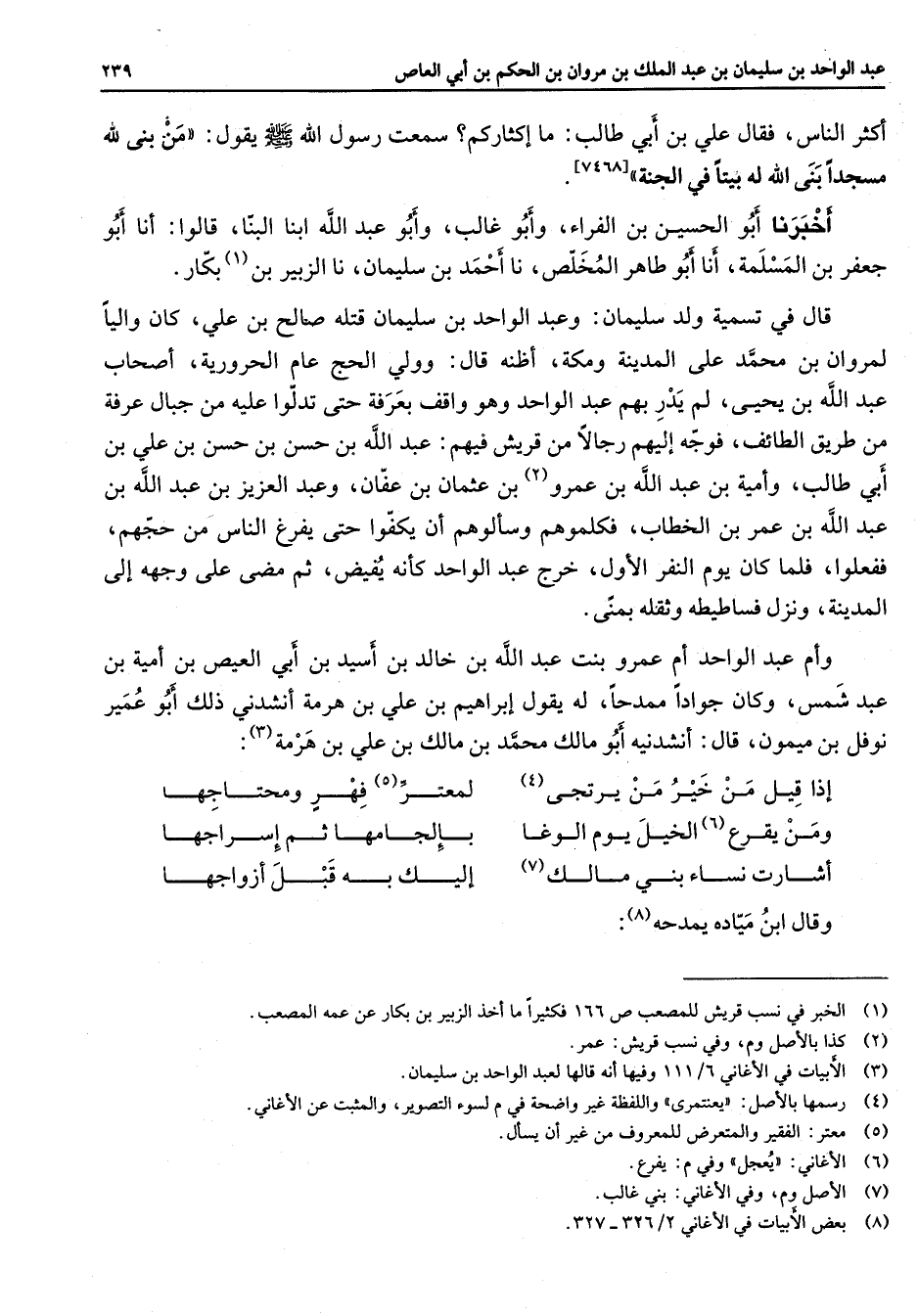 أكثر الناس فقال علي بن أبي طالب ما إكثاركم سمعت رسول الله (صلى الله عليه وسلم) يقول من بنى لله مسجدا بنى الله له بيتا في الجنة [7468 أخبرنا أبو الحسين بن الفراء وأبو غالب وابو عبد الله ابنا البنا قالوا أنا أبو جعفر بن المسلمة أنا أبو طاهر المخلص نا أحمد بن سليمان نا الزبير بن (1) بكار قال في تسمية ولد سليمان وعبد الواحد بن سليمان قتله صلاح بن علي كان واليا لمروان بن محمد علي المدينة ومكة اظنه قال وولي الحج عام الحرورية أصحاب عبد الله بن يحيى لم يدر بهم عبد الواحد وهو واقف بعرفة حتى تدلوا عليه من جبال عرفه من طريق الطائف فوجه إليهم رجلا من قريش فيهم عبد الله بن حسن بن حسن بن علي بن أبي طالب وأمية بن عبد الله بن عمرو (2) بن عثمان بن عفان وعبد العزيز بن عبد الله بن عبد الله بن عمر بن الخطاب فكلموهم وسألوهم أن يكفوا حتى يفرغ الناس من حجهم ففعلوا فلما كان يوم النفر الأول خرج عبد الواحد كأنه يفيض ثم مضى على وجهه إلى المدينة ونزل فساطيطة وثقله بمنى وأم عبد الواحد ام عمرو بنت عبد الله بن خالد بن اسيد بن أبي العيص بن أمية بن عبد شمس وكان جوادا ممدحا له يقول إبراهيم بن علي بن هرمة انشدني ذلك أبو عمير نوفل بن ميمون قال انشدنية أبو مالك محمد بن مالك بن علي بن هرمة (3) * إذا قيل من خير من يرتجى (4) * لمعتر (5) فهر ونحتاجها ومن يقرع (6) الخيل يوم الوغا * بإلجامها ثم إسراجها أشارت نساء بني مالك (7) * إليك به قبل أزواجها * وقال ابن مياده يمدحه (8)