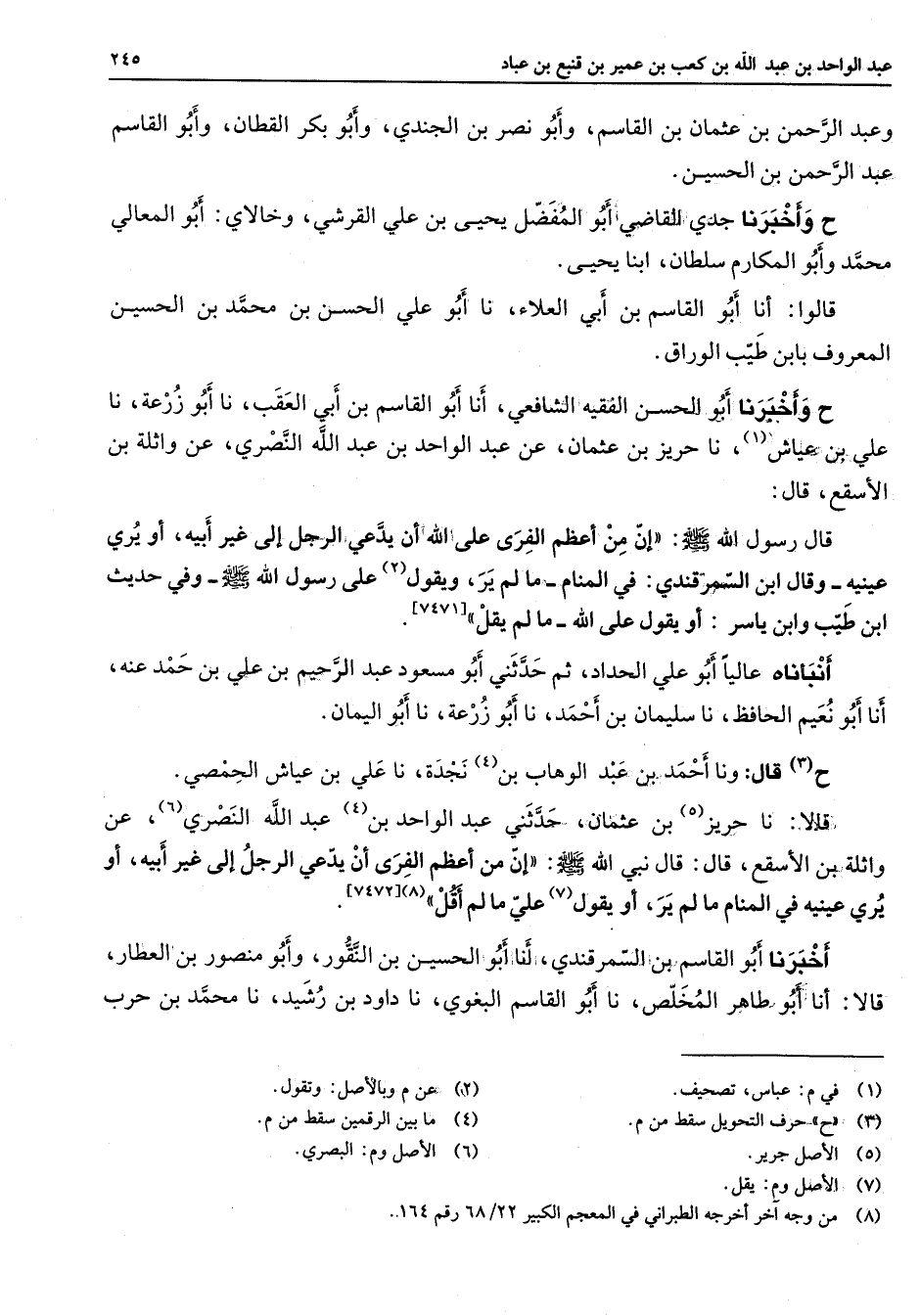 وعبد الرحمن بن عثمان بن القاسم وأبو نصر بن الجندي وأبو بكر القطان وأبو القاسم عبد الرحمن بن الحسين ح وأخبرنا جدي القاضي أبو المفضل يحيى بن علي القرشي وخالاي أبو المعالي محمد وأبو المكارم سلطان ابنا يحيى قالوا أنا أبو القاسم بن ابي العلاء نا أبو علي الحسن بن محمد بن الحسين المعروف بابن طيب الوراق ح وأخبرنا أبو الحسن الفقية الشافعي أنا أبو القاسم بن أبي العقب نا أبو زرعة نا علي بن عياش (1) نا حريز عن عثمان بن عبد الواحد بن عبد الله النصري عن واثلة بن الأسقع قال قال رسول الله (صلى الله عليه وسلم) إن من أعظم الفرى على الله ان يدعى الرجل إلى غير أبيه أو يرى عينيه وقال ابن السمرقندي في المنام ما لم ير ويقول (2) على رسول الله (صلى الله عليه وسلم) وفي