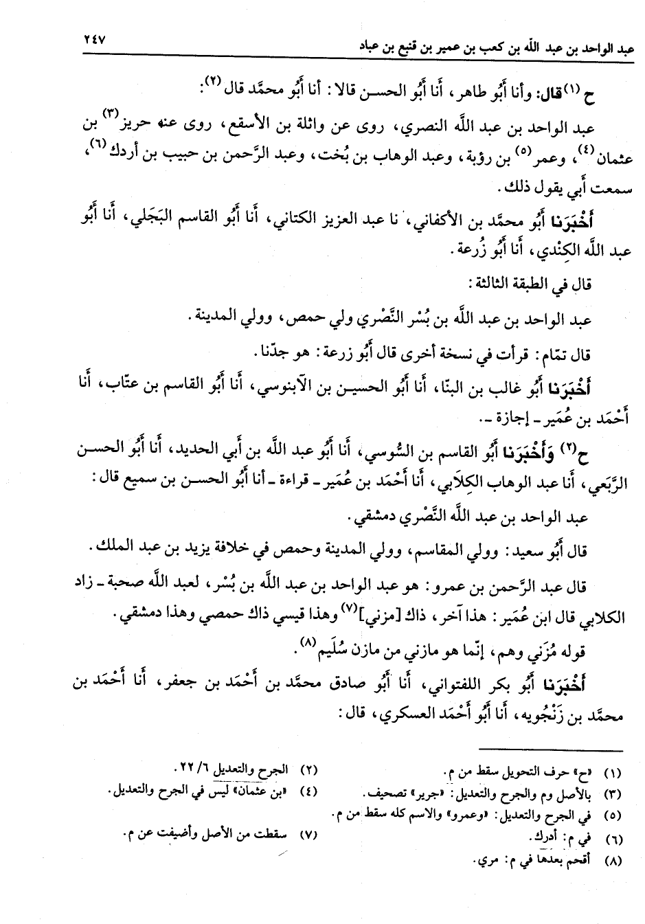 ح (1) قال وأنا أبو طاهر أنا أبو الحسن أنا أبو محمد قال (2) عبد الواحد بن عبد الله النصري روى عن واثلة بن الأسقع روى عنه حريز (3) بن عثمان (4) وعمر (5) بن رؤبة وعبد الوهاب بن بخت وعبد الرحمن بن حبيب بن اردكت (6) سمعت أبي يقول ذلك أخبرنا أبو محمد بن الأكفاني نا عبد العزيز الكتاني أنا أبو القاسم البجلي أنا أبو عبد الله الكندي أنا أبو زرعة قال في الطبقة الثالثة عبد الواحد بن عبد الله بن بسر النصري ولي حمص وولي المدينة قال تمام قرأت في نسخة أخرى قال أبو زرعة هو جدنا أخبرنا أبو غالب بن البنا أنا أبو الحسين بن الآبنوسي أنا أبو القاسم بن عتاب انا أحمد بن عمير إجازة ح (2) وأخبرنا أبو القاسم بن السوسي أنا أبو عبد الله بن أبي الحديد أنا أبو الحسن الربعي أنا عبد الوهاب الكلابي أنا أحمد بن عمير قراءة أنا أبو الحسن بن سميع قال عبد الواحد بن عبد الله النصري دمشقي قال أبو سعيد وولي المقاسم وولي المدينة وحمص في خلافة يزيد بن عبد الملك قال عبد الرحمن بن عمرو هو عبد الواحد بن عبد الله بن بسر لعبد الله صحبة زاد الكلابي قال ابن عمير هذا آخر ذاك مزني (7) وهذا قيسي ذاك حمصي وهذا دمشقي قوله مزني وهم إنما وهم إنما هو مازني من مازن سليم (8) اخبرنا أبو بكر اللفتواني أنا أبو صادق محمد بن أحمد بن جعفر أنا احمد بن محمد بن زنجوية أنا أبو أحمد العسكري قال