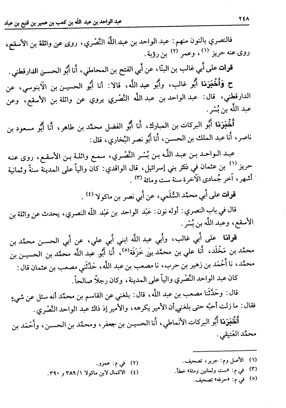 فالنصري بالنون منهم عبد الواحد بن عبد الله النصري روى عن واثلة بن الأسقع روى عنه حريز (1) وعمر (2) بن رؤبة قرأت على ابي غالب بن البنا عن أبي الفتح بن المحاملي أنا أبو الحسن الدارقطني ح وأخبرنا أبو غالب وأبو عبد الله قالا أنا أبو الحسين بن الآبنوسي عن الدراقطني قال عبد الواحد بن عبد الله النصري يروي عن واثلة بن الأسقع وعن عبد الله بن بسر أخبرنا أبو البركات بن المبارك أنا أبو الفضل محمد بن طاهر انا أبو مسعود بن ناصر أنا عبد الملك بن الحسن أنا أبو نصر البخاري قال عبد الواحد بن عبد الله بن بسر النصري سمع واثلة بن الأسقع روى عنه حريز (1) بن عثمان في ذكر بني إسرائيل قال الواقدي كان واليا على المدينة سنة وثمانية أشهر آخر جمادى الآخرة سنة ست ومائة (3) قرأت على ابي محمد السلمي عن أبي نصر بن ماكولا (4) قال في باب النصري أو له نون عبد الواحد بن عبد الله النصري يحدث عن واثله بن الأسقع وعبد الله بن بسر قرأنا على أبي غالب وابي عبد الله ابني ابي علي عن أبي الحسن محمد بن محمد بن مخلد أنا علي بن محمد بن خزفة (5) انا أبو عبد الله محمد بن الحسين بن محمد نا أحمد بن زهير بن حرب نا مصعب بن عبد الله حدثني مصعب بن عثمان قال كان عبد الواحد النصري واليا على المدينة وكان رجلا صالحا قال وحدثنا مصعب بن عبد الله قال بلغني عن القاسم بن محمد أنه سئل عن شئ فقال ما زلت احبه حتى بلغني أن الأمير يكرهه والأمير إذا ذاك عبد الواحد النصري أخبرنا أبو البركات الأنماطي أنا الحسين بن جعفر ومحمد بن الحسن وأحمد بن محمد العتيقي