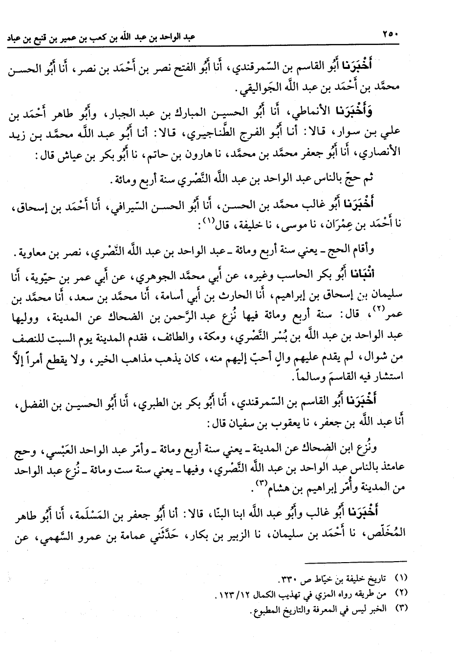 أخبرنا أبو القاسم بن السمرقندي أنا أبو الفتح نصر بن أحمد بن نصر أنا أبو الحسن محمد بن أحمد بن عبد الله الجواليقي واخبرنا الأنماطي أنا أبو الحسين المبارك بن عبد الجبار وأبو طاهر أحمد بن علي بن سوار قالا أنا أبو الفرج الطناجيري قالا أنا أبو عبد الله محمد بن زيد الأنصاري أنا أبو جعفر محمد بن محمد نا هارون بن حاتم نا أبو بكر بن عياش قال ثم حج بالناس عبد الواحد بن عبد الله النصري سنة أربع ومائة أخبرنا أبو غالب محمد بن الحسن أنا أبو الحسن السيرافي أنا أحمد بن إسحاق نا أحمد بن عمران نا موسى نا خليفة قال (1) وأقام الحج يعني سنة أربع ومائة عبد الواحد بن عبد الله النصري نصر بن معاوية أنبأنا أبو بكر الحاسب وغيره عن أبي محمد الجوهري عن أبي عمر بن حيوية أنا سليمان بن إسحاق بن إبراهيم أنا الحارث بن أبي اسامة أنا محمد بن سعد أنا محمد بن عمر (2) قال سنة أربع ومائة فيها نزع عبد الرحمن بن الضحاك عن المدينة ووليها عبد الواحد بن عبد الله بن بسر النصري ومكة والطائف فقدم المدينة يوم السبت للنصف من شوال لم يقدم عليهم وأل أحب إليهم منه كان يذهب مذاهب الخير ولا يقطع أمرا إلا استشار فيه القاسم وسالما أخبرنا أبو القاسم بن السمرقندي أنا أبو بكر بن الطبري أنا أبو الحسين بن الفضل أنا عبد الله بن جعفر نا يعقوب بن سفيان قال ونزع ابن الضحاك عن المدينة يعنن سنة أربع ومائة وأمر عبد الواحد العبسي وحج عامئذ بالناس عبد الواحد بن عبد الله النصري وفيها يعني سنة ست ومائة نزع عبد الواحد من المدينة وأمر إبراهيم بن هشام (3) أخبرنا أبو غالب وابو عبد الله ابنا البنا قالا أنا أبو جعفر بن المسلمة أنا أبو طاهر المخلص نا أحمد بن سليمان نا الزبير بن بكار حدثني عمامة بن عمرو السهمي عن