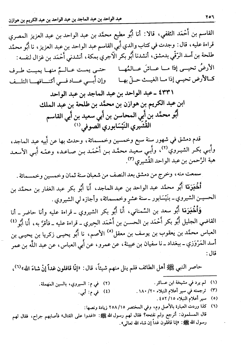 4331 - عبد الواحد بن عبد الماجد بن عبد الواحد ابن عبد الكريم بن هوازن بن محمد بن طلحة بن عبد الملك أبو محمد بن أبي المحاسن بن أبي سعيد بن أبي القاسم القشيري النيسابوري الصوفي (1) قدم دمشق في شهور سنة سبع وخمسين وخمسمائة وحدث بها عن أبيه عبد الماجد وابي بكر الشيروي (2) وأبي سعيد محمد بن أحمد بن صاعد وعمه ابي الأسعد هبة الرحمن بن عبد الواحد القشيري (3) سمعت منه وخرج من دمشق بعد النصف من شعبان سنة ثمان وخمسين وخمسائة أخبرنا أبو محمد عبد الواحد بن عبد الماجد أنا أبو بكر عبد الغفار بن محمد بن الحسين الشيروي بنيسابور سنة عشر وخمسمائة وأجازة لي الشيروي وأخبرنا أبو سعد بن السمناني أنا أبو بكر الشيروي قراءة عليه وأنا حاضر أنا القاضي الجليل أبو بكر أحمد بن الحسن بن احمد الحيري قراءة عليه فأقر به أنا أبو (4) العباس محمد بن يعقوب بن يوسف بن معقل (5) الأصم نا أبو يحيى زكريا بن يحيى بن اسد المروزي ببغداد نا سفيان بن عيينة عن عمرو عن أبي العباس عن عبد الله بن عمر قال حاصر النبي (صلى الله عليه وسلم) اهل الطائف فلم ينل منهم شيئا قال إنا قافلون غدا إن شاء الله (6)