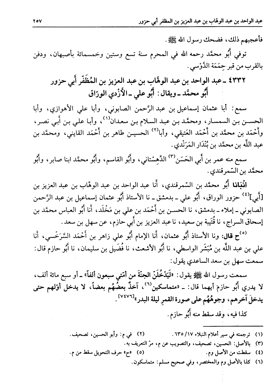 4332 - عبد الواحد بن عبد الوهاب بن عبد العزيز بن المظفر أبي حزور أبو محمد ويقال أبو علي الأزدي الوراق سمع أبا عثمان إسماعيل بن عبد الرحمن الصابوني وأبا علي علي الأهوازي وأبا الحسن بن السمسار ومحمد بن عبد السلام بن سعدان (1) وأبا علي بن أبي نصر وأحمد بن محمد بن أحمد العتيقي وأبا (2) الحسين طاهر بن احمد القايني ومحمد بن عبد الله بن محمد بن بندار المرندي سمع منه عمر بن ابي الحسن (3) الدهستاني وابو القاسم وابو محمد ابنا صابر وأبو محمد بن السمرقندي أنبأنا أبو محمد بن السمرقندي أنا عبد الواحد بن عبد الوهاب بن عبد العزيز بن أبي (4) حزور الوراق أبو علي بدمشق نا الأستاذ أبو عثمان إسماعيل بن عبد الرحمن الصابوني إملاء بدمشق نا الحسن بن أحمد بن علي بن مخلد أنا أبو العباس محمد بن إسحاق السراج نا قتيبة بن سعيد نا عبد العزيز بن أبي حازم عن سهل بن سعد (5) ح قال ونا الأستاذ أبو عثمان أنا الإمام أبو علي زاهر بن احمد السرخسي أنا علي بن عبد الله بن مبشر الواسطي نا أبو الأشعث نا فضيل بن سليمان نا أبو حازم قال سمعت سهل بن سعد الساعدي يقول سمعت رسول الله (صلى الله عليه وسلم) يقول ليدخلن الجنة من أمتي سبعون ألفا أو سبع مائة ألف لا يدري أبو حازم أيهما قال متماسكين (6) آخذ بعضهم بعضا لا يدخل أولهم حتى يدخل آخرهم وجوههم على صورة القمر ليلة البدر