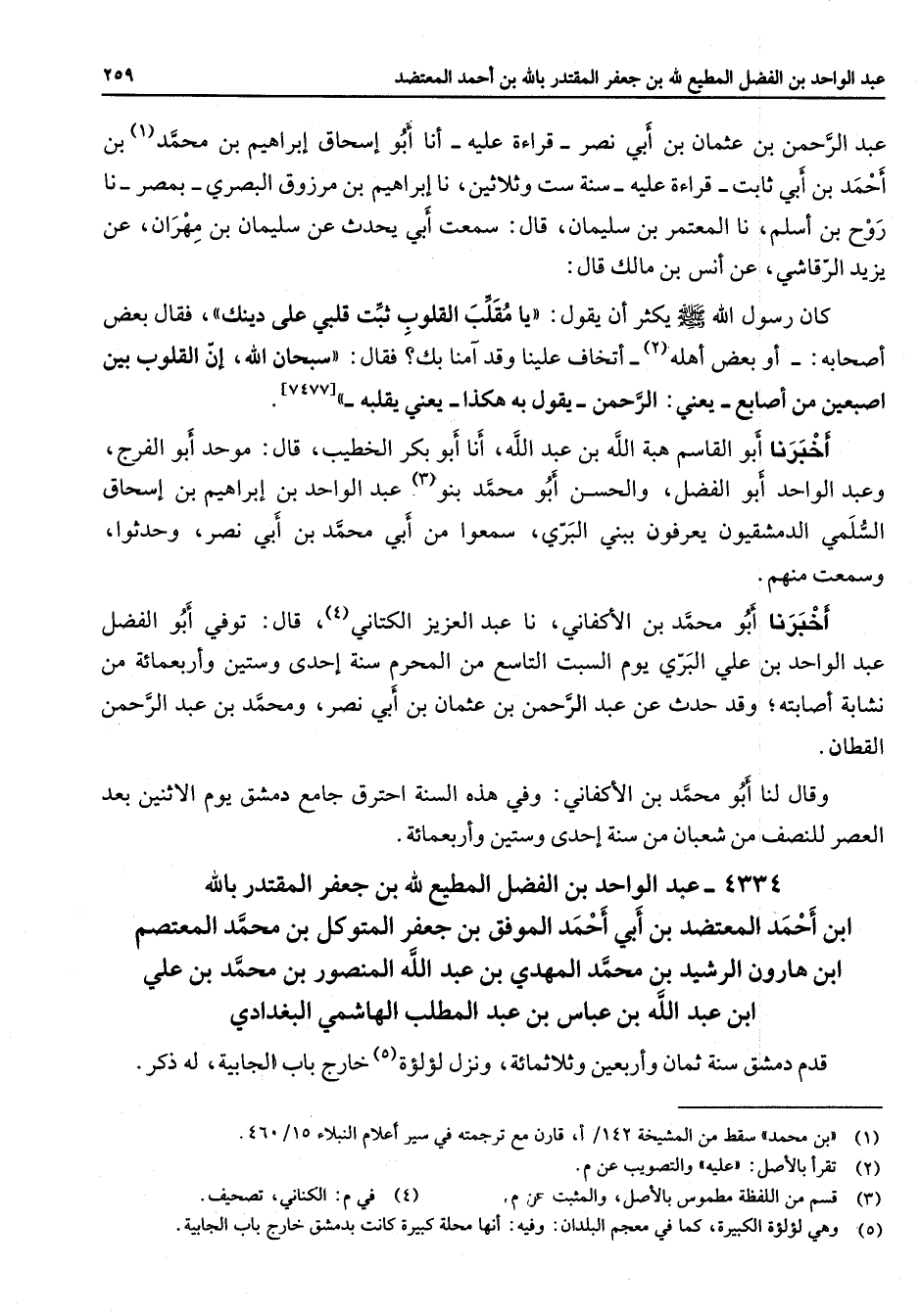 4334 - عبد الواحد بن الفضل المطيع لله بن جعفر المقتدر بالله ابن أحمد المعتضد بن أبي أحمد الموفق بن جعفر المتوكل بن محمد المعتصم ابن هارون الرشيد بن محمد المهدي بن عبد الله المنصور بن محمد بن علي ابن عبد الله بن عباس بن عبد المطلب الهاشمي البغدادي قدم دمشق سنة ثمان وأربعين وثلاثمائة ونزل لؤلؤة (5) خارج باب الجابية له ذكر