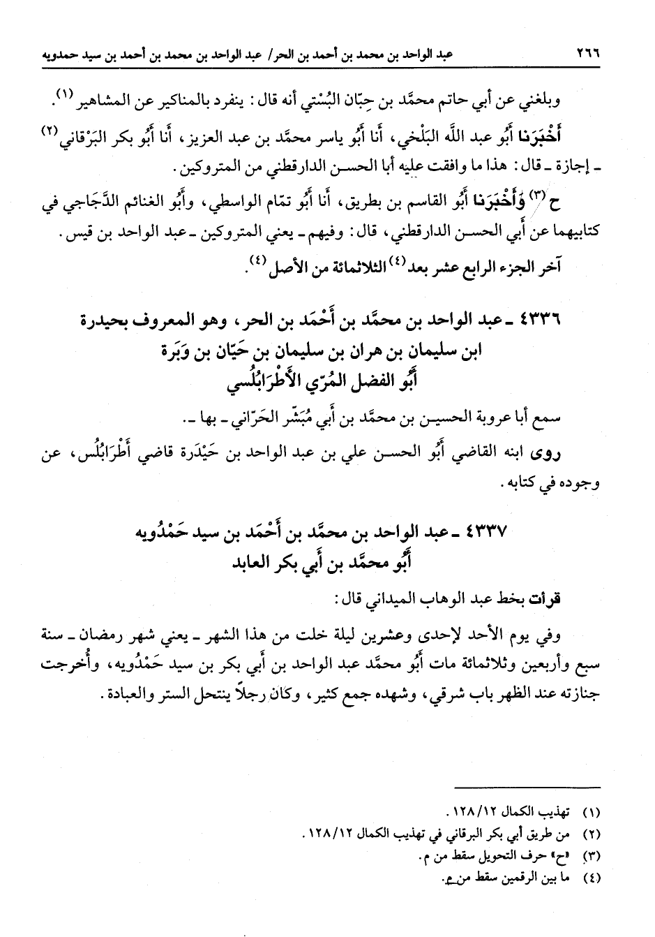 4337 - عبد الواحد بن محمد بن أحمد بن سيد حمدوية أبو محمد بن أبي بكر العابد قرأت بخط عبد الوهاب الميداني قال وفي يوم الأحد لإحدى وعشرين ليلة خلت من هذا الشهر يعني شهر رمضان سنة سبع وأربعين وثلاثمائة مات أبو محمد عبد الواحد بن أبي بكر بن سيد حمدوية واخرجت جنازته عند الظهر باب شرقي وشهده جمع كثير وكان رجلا ينتحل الستر والعبادة