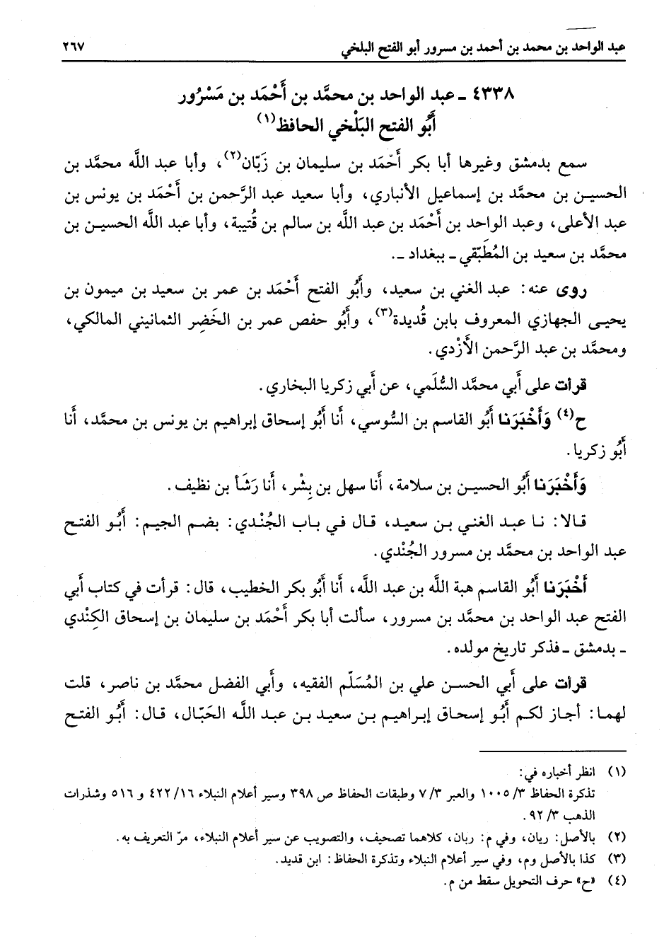 4338 - عبد الواحد بن محمد بن أحمد بن مسرور أبو الفتح البلخي الحافظ (1) سمع بدمشق وغيرها أبا بكر أحمد بن سليمان بن زبان (2) وأبا عبد الله محمد بن الحسين بن محمد بن إسماعيل الأنباري وأبا سعيد عبد الرحمن بن احمد بن يونس بن عبد الأعلى وعبد الواحد بن أحمد بن عبد الله بن سالم بن قتيبة وأبا عبد الله الحسين بن محمد بن بن سعيد المطبقي ببغداد روى عنه عبد الغني بن سعيد وابو الفتح أحمد بن عمر بن سعيد بن ميمون بن يحيى الجهازي المعروف بابن قديدة (3) وأبو حفص عمر بن الخضر الثمانيني المالكي ومحمد بن عبد الرحمن الأزدي قرأت علي أبي محمد السلمي عن أبي زكريا البخاري ح (4) وأخبرنا أبو القاسم بن السوسي أنا إبو إسحاق إبراهيم بن يونس بن محمد أنا أبو زكريا وأخبرنا أبو الحسين بن سلامة انا سهل بن بشر أنا رشأ بن نظيف قالا نا عبد الغني بن سعيد قال في باب الجندي بضم الجيم أبو الفتح عبد الواحد بن محمد بن مسرور الجندي أخبرنا أبو القاسم هبة الله بن عبد الله أنا أبو بكر الخطيب قال قرأت في كتاب أبي الفتح عبد الواحد بن محمد بن مسرور سألت أبا بكر أحمد بن سليمان بن إسحاق الكندي بدمشق فذكر تاريخ مولده قرأت علي أبي الحسن علي بن المسلم الفقية وأبي الفضل محمد بن ناصر قلت لهما أجاز لكم أبو إسحاق إبراهيم بن سعيد بن عبد الله الحبال قال أبو الفتح