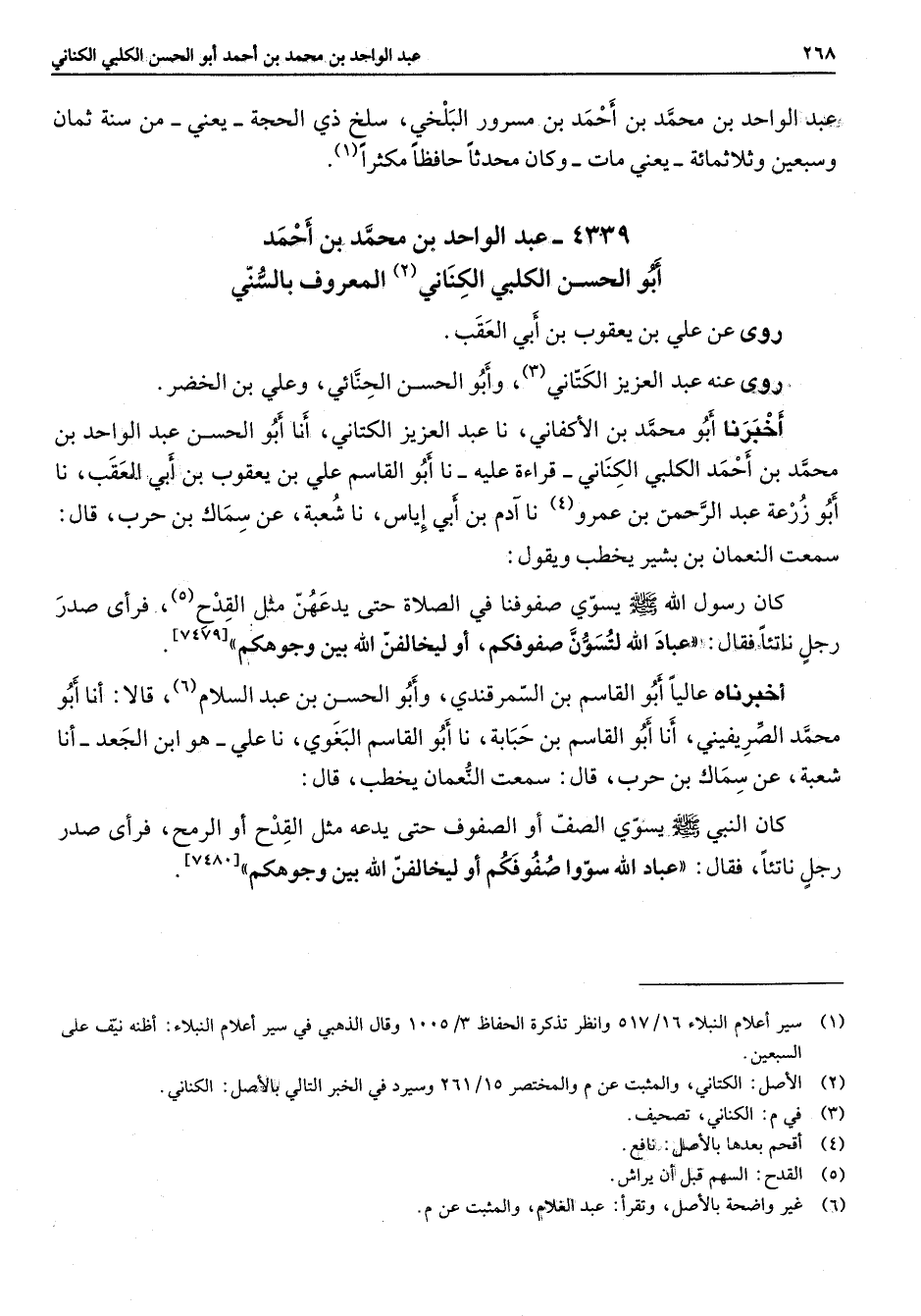 4339 - عبد الواحد بن محمد بن أحمد أبو الحسن الكلبي الكناني (2) المعروف بالسني روى عن علي بن يعقوب بن أبي العقب روى عنه عبد العزيز الكتاني (3) وابو الحسن الحنائي وعلي بن الخضر أخبرنا أبو محمد بن الأكفاني نا عبد العزيز الكتاني أنا بو الحسن عبد الواحد بن محمد بن أحمد الكلبي الكناني قراءة عليه نا أبو القاسم علي بن يعقوب بن أبي العقب نا أبو زرعة عبد الرحمن بن عمرو (4) نا آدم بن أبي إياس نا شعبة عن سماك بن حرب قال سمعت النعمان بن بشير يخطب ويقول كان رسول الله (صلى الله عليه وسلم) يسوى صفوفنا في الصلاة حتى يدعهن مثل القدح (5) فرأى صدر رجل ناتئا فقال عباد الله لتسون صفوفكم أو ليخالفن الله بين وجوهكم