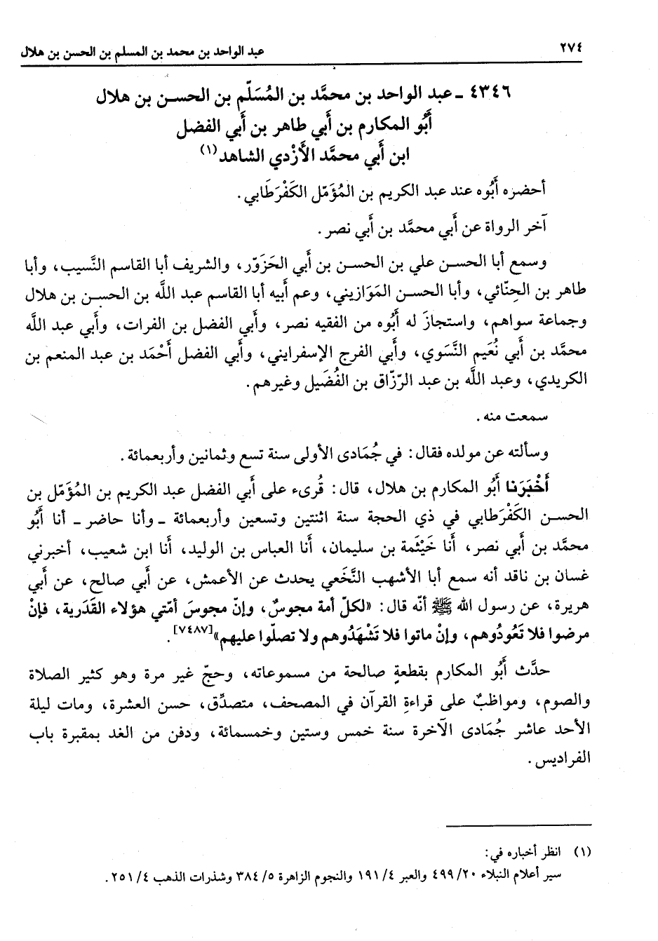 4346 - عبد الواحد بن محمد بن المسلم بن الحسن بن هلال أبو المكارم بن أبي بن طاهر ابي الفضل ابن أبي محمد الأزدي الشاهد (1) أحضره أبوه عند عبد الكريم بن المؤمل الكفرطابي آخر الرواة عن أبي محمد بن ابي نصر وسمع ابا الحسن علي بن الحسن بن أبي الحزور والشريف أبا القاسم النسيب وأبا طاهر بن الحنائي وأبا الحسن الموازيني وعم ابيه أبا القاسم عبد الله بن الحسن بن هلال وجماعة سواهم واستجاز له أبوه من الفقية نصر وابي الفضل بن الفرات وابي عبد الله محمد بن أبي نعيم النسوي وأبي الفرج الإسفرايني وابي الفضل احمد بن عبد المنعم بن الكريدي وعبد الله بن عبد الرزاق بن الفضيل وغيرهم سمعت منه وسالته عن مولده فقال في جمادى الأولى سنة تسع وثمانين وأربعمائة أخبرنا أبو المكارم بن هلال قرئ على أبي الفضل عبد الكريم بن المؤمل بن الحسن الكفرطابي في ذي الحجة سنة اثنتين وتسعين وأربعمائة وأنا حاضر أنا أبو محمد بن أبي نصر أنا خيثمة بن سليمان أنا العباس بن الوليد أنا أبن شعيب اخبرني غسان بن ناقد انه سمع أبا الأشهب النخعي يحدث عن الأعمش عن أبي صالح عن ابي هريرة عن رسول الله (صلى الله عليه وسلم) أنه قال لكل أمة مجوس وإن مجوس امتي هؤلاء القدرية فان مرضوا فلا تعودوهم وإن ماتوا فلا تشهدوهم ولا تصلوا عليهم
