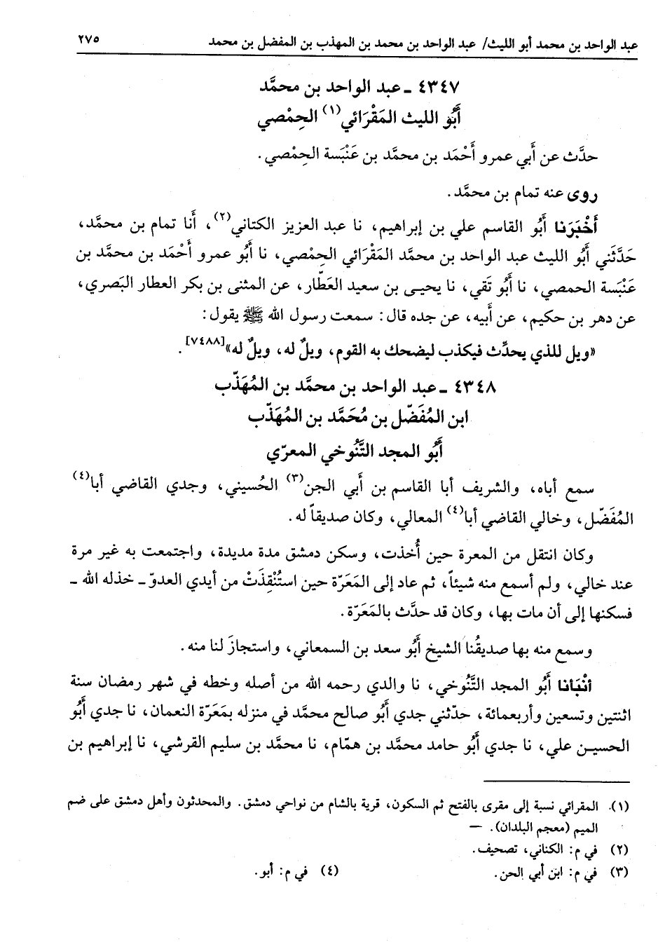 4347 - عبد الواحد بن محمد أبو الليث المقرائي (1) الحمصي حدث عن أبي عمرو أحمد بن محمد بن عنبسة الحمصي روى عنه تمام بن محمد أخبرنا أبو القاسم علي بن إبراهيم نا عبد العزيز الكتاني (2) أنا تمام بن محمد حدثني أبو الليث عبد الواحد بن محمد المقرائي الحمصي نا أبو عمر وأحمد بن محمد بن عنبسة الحمصي نا أبو تقي نا يحيى بن سعيد العطار عن المثنى بن بكر العطار البصري عن دهر بن حكيم عن أبيه عن جده قال سمعت رسول الله (صلى الله عليه وسلم) يقول ويل للذي يحدث فيكذب ليضحك به القوم ويل له ويل له