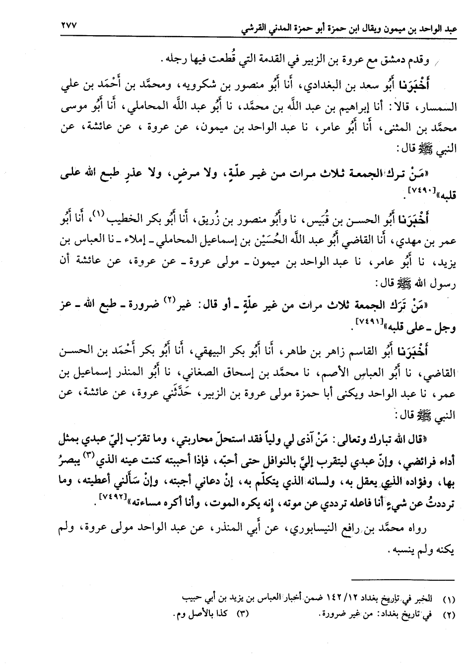 [7490] أخبرنا أبو الحسن بن قبيس نا وابو منصور بن زريق أنا أبو بكر الخطيب (1) أنا أبو عمر بن مهدي أنا القاضي أبو عبد الله الحسين بن إسماعيل المحاملي إملاء نا العباس بن يزيد نا أبو عامر نا عبد الواحد بن ميمون مولى عروة عن عروة عن عائشة أن رسول الله (صلى الله عليه وسلم) قال من ترك الجمعة ثلاث مرات من غير علة أو قال غير (2) ضرورة طبع الله عز وجل على قلبه