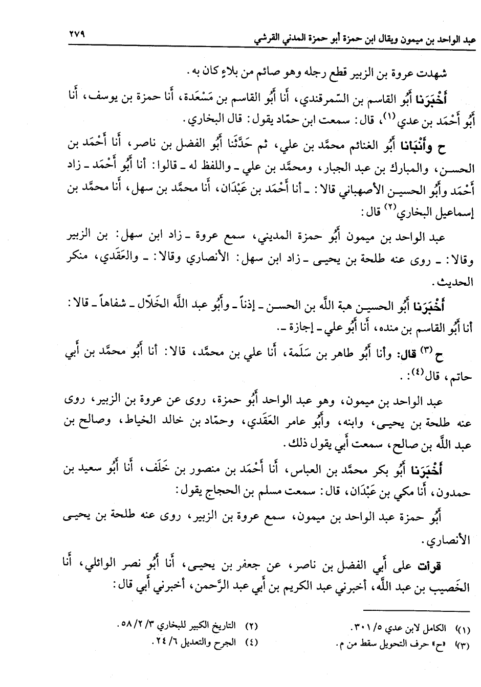 شهدت عروة بن الزبير قطع رجله وهو صائم من بلاء كان به أخبرنا أبو القاسم بن السمرقندي أنا أبو القاسم بن مسعدة أنا حمزة بن يوسف أنا أبو احمد بن عدي (1) قال سمعت أبن حماد يقول قال البخاري ح وأنبأنا أبو الغنائم محمد بن علي ثم حدثنا أبو الفضل بن ناصر أنا أحمد بن الحسن والمبارك بن عبد الجبار ومحمد بن علي واللفظ له قالوا أنا أبو أحمد زاد أحمد وأبو الحسين الأصبهاني قالا أنا أحمد بن عبدان أنا محمد بن سهل أنا محمد بن إسماعيل البخاري (2) قال عبد الواحد بن ميمون أبو حمزة المديني سمع عروة زاد ابن سهل بن الزبير وقالا روى عنه طلحة بن يحيى زاد ابن سهل الأنصاري وقالا والعقدي منكر الحديث اخبرنا أبو الحسين هبة الله بن الحسن إذنا وأبو عبد الله الخلال شفاها قالا أنا أبو القاسم بن مندة أنا أبو علي إجازة ح (3) قال وأنا أبو طاهر بن سملة أنا علي بن محمد قالا انا أبو محمد بن أبي حاتم قال (4) عبد الواحد بن ميمون وهو عبد الواحد أبو حمزة روى عن عروة بن الزبير روى عنه طلحة بن يحيى وابنه وابو عامر العقدي وحماد بن خالد الخياط وصالح بن عبد الله بن صالح سمعت أبي يقول ذلك اخبرنا أبو بكر محمد بن العباس أنا أحمد بن منصور بن خلف أنا أبو سعيد بن حمدون أنا مكي بن عبدان قال سمعت مسلم بن الحجاج يقول أبو حمزة عبد الواحد بن ميمون سمع عروة بن الزبير روى عنه طلحة بن يحيى الأنصاري قرأت على أبي الفضل بن ناصر عن جعفر بن يحيى أنا أبو نصر الوائلي أنا الخصيب بن عبد الله أخبرني عبد الكريم بن أبي عبد الرحمن أخبرني أبي قال