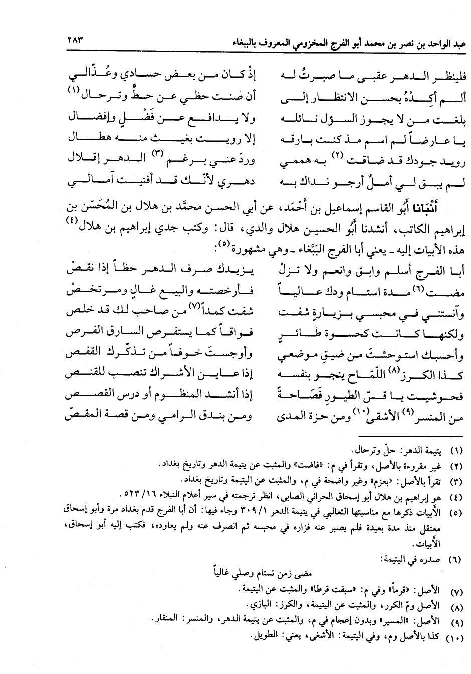(5) الابيات ذكرها مع مناسبتها الثعالبي في يتيمة الدهر 1 / 309 وجاء فيها: أن أبا الفرج قدم بغداد مرة وأبو إسحاق