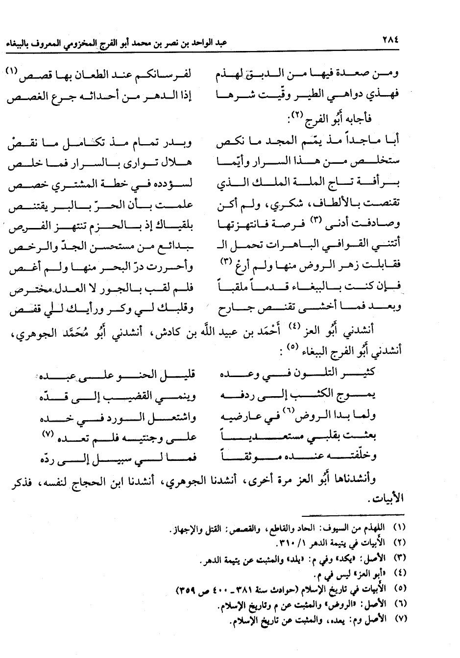 ومن صعدة فيها من الدبق لهذم * لفرسانكم عند الطعان بها قصص فهذي دواهي الطير وقيت شرها * إذا الدهر من أحداثه جرع الغصص * فأجابه أبو الفرج (2) * أبا ماجدا مذ يمم المجد مانكص * وبدر تمام مذ تكامل ما نقص ستخلص من هذا السرار وأيما * هلال توارى بالسرار فما خلص برافة تاج الملة الملك الذي * لسؤدده في خطة المشتري خصص تقنصت بالألطاف شكري ولم أكن * علمت بان الحر بالبر يقتنص وصادقت أدنى (3) فرصة فانتهزتها * بلقياك إذا بالحزم تنتهز الفرص أتتني القوافي الباهرات تحمل ال * بدائع من مستحسن الجد والرخص فقابلت زهر الروض منها ولم ارع (3) * وأحررت در البحر منها ولم أغص فإن كنت بالببغاء قدما ملقبا * فلم لقب بالجور لا العدل مخترص وبعد فما اخشى تقنص جارح * وقلبك لي وكر ورأيك لي قفص * أنشدني أبو العز (4) أحمد بن عبيد الله بن كادش أنشدني أبو محمد الجوهري أنشدني أبو الفرج الببغاء (5) * كثير التلون في وعده * قليل الحنو على عبده يموج الكثب إلى ردفه * وينمى القضيب إلى قدة ولما بدا الروض (6) في عارضية * واشتعل الورد في خده بعثت بقلبي مستعديا * على وجنتيه فلم تعده (7) وخلفته عنده موثقا * فما لي سبيل إلى رده * وأنشدناها أبو العز مرة أخرى ارشدنا الجوهري أنشدنا ابن الحجاج لنفسه فذكر الأبيات