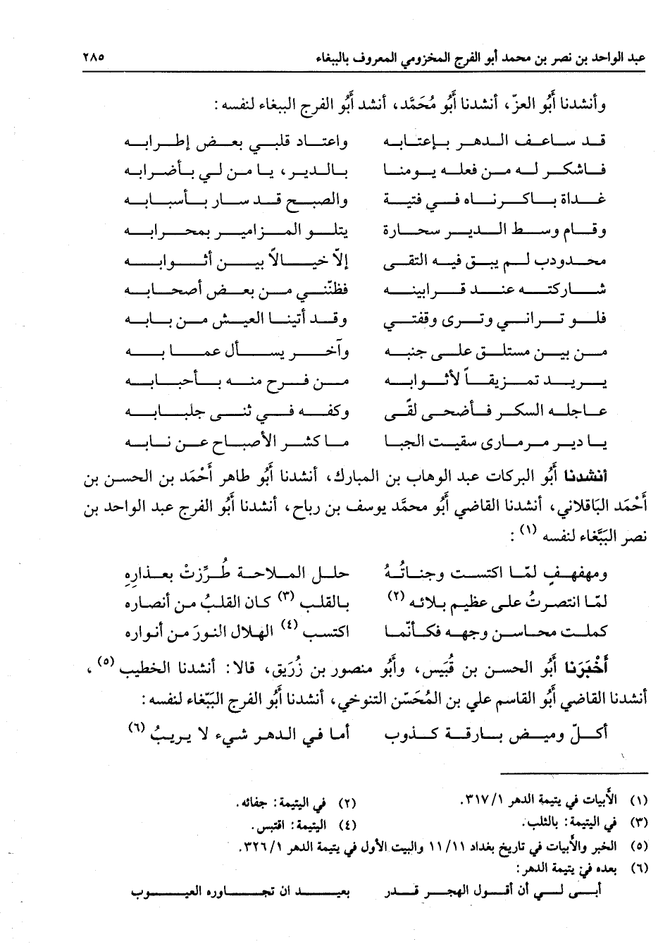 (5) الخبر والابيات في تاريخ بغداد 11 / 11 والبيت الاول في يتيمة الدهر 1 / 326