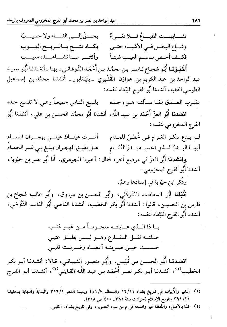 تشابهت الطباع فلا دنئ * بحق إلى الثناء ولا حسيب وشاع البخل في الأشياء حتى * يكاد تشح بالريح الهبوب فكيف أخص باسم العيب شيئا * وأكثر ما نشاهده معيب * أخبرنا أبو شجاع ناصر بن محمد بن أحمد النوقاني بها أنشدنا أبو سعيد عبد الواحد بن عبد الكريم بن هوازن القشيري بنيسابور أنشدنا محمد بن إسماعيل الطوسي الفقية أنشدنا ألو الفرج الببغاء لنفسه * عقرب الصدق لما سألنه هو وحده * يلسع الناس جميعا وهي لا تلسع حده * أنشدنا أبو العز أحمد بن عبيد الله أنشدنا أبو محمد الحسن بن علي أنشدنا أبو الفرج المخزومي لنفسه * لم يدع سكر الغرام في خطى للمدام * أمرت عيناك عيني بهجران المنام أيها البدر الذي نحسبه بدر التمام * هل يطيق الهجران يبلغ بي غير الحمام * وأنشدنا أبو العز في موضع آخر فقال أخبرنا الجوهري أنا أبو عمر بن حيوية انشدنا أبو الفرج المخزومي وذكر ابن حيوية في إسنادها وهم أنبأنا أبو السعادات المتوكلي وأبو الحسن بن مرزوق وأبو إبو غالب شجاع بن فارس بن الحسين قالوا أنشدنا أبو بكر الخطيب أنشدنا القاضي أبو القاسم التنوخي أنشدنا أبو الفرج الببغاء لنفسه * يا ذا الذي عاينته متجرما من غير ذنب * حملته ثقل المقارع وهو ليس يطيق عتبي * حسست حين ضربته أعضاه وضربت قلبي أنشدنا أبو الحسن بن قبيس وأبو منصور الشيباني قالا انشدنا أبو بكر الخطيب (1) أنشدنا أبو بكر نصر أحمد بن عبد الله القايني (2) أنشدنا أبو الفرج
