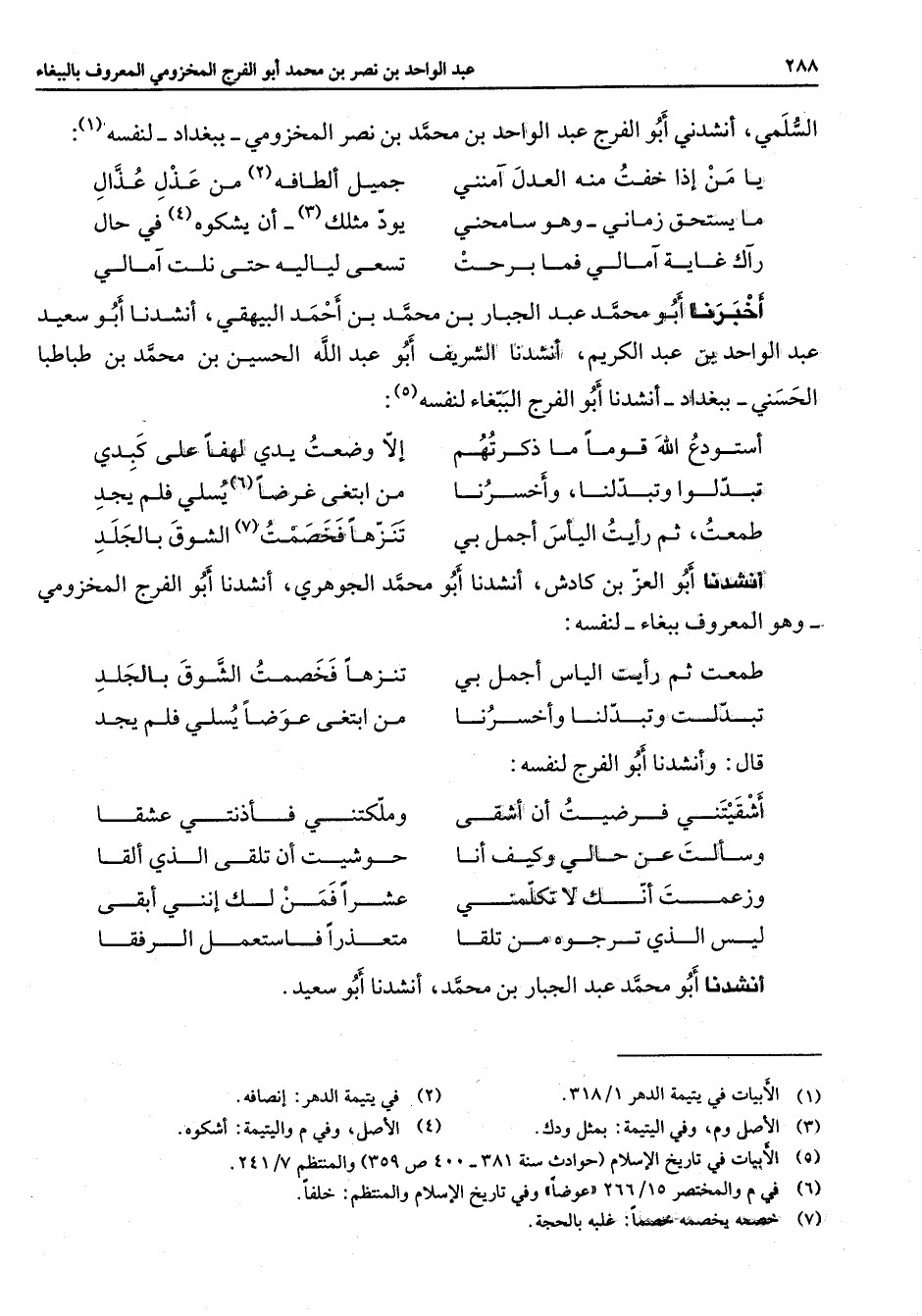 السلمي أنشدنا أبو الفرج عبد الواحد بن محمد بن نصر المخزومي ببغداد لنفسه (1) * يا من إذا خفت منه العدل آمنني * جميل ألطافه (2) من عذل عذال ما يستحق زماني وهو سامحني * يود مثلك (3) ان يشكوه (4) في حال رآك غاية آمالي فما برحت * تسعى لياليه حتى نلت آمالي * أخبرنا أبو محمد عبد الحبار بن محمد بن أحمد البيهقي أنشدنا أبو سعيد عبد الواحد بن عبد الكريم انشدنا الشريف أبو عبد الله بن الحسين بن محمد بن طباطبا الحسني ببغداد أنشدانا أبو الفرج الببغاء لنفسه (5) * أستودع الله قوما ما ذكرتهم * إلا وضعت يدي لهفا على كبدي تبدلوا وتبدلنا وأخسرنا * من ابتغى غرضا (6) يسلي فلم يجد طمعت ثم رأيت اليأس أجمل بي * تنزها فخصمت (7) الشوق بالجلد * أنشدنا أبو العز بن كادش أنشدنا أبو محمد الجوهري أنشدنا أبو الفرج المخزومي وهو المعروف ببغاء لنفسه * طمعت ثم رأيت الياس أجمل بي * تنزها فخصمت الشوق بالجلد تبدلت وتبدلنا وأخسرنا * من ابتغى عوضا يسلي فلم يجد * قال وأنشدنا أبو الفرج لنفسه * أشقيتني فرضيت أن أشقى * وملكتني فاذنتي عشقا وسألت عن حالي وكيف أنا * حوشيت أن تلقى الذي ألقا وزعمت أنك لا تكلمني * عشرا فمن لك إنني أبقى ليس الذي ترجوه من تلقا * متعذرا فاستعمل الرفقا * أنشدنا أبو محمد عبد الجبار بن محمد أنشدنا أبو سعيد