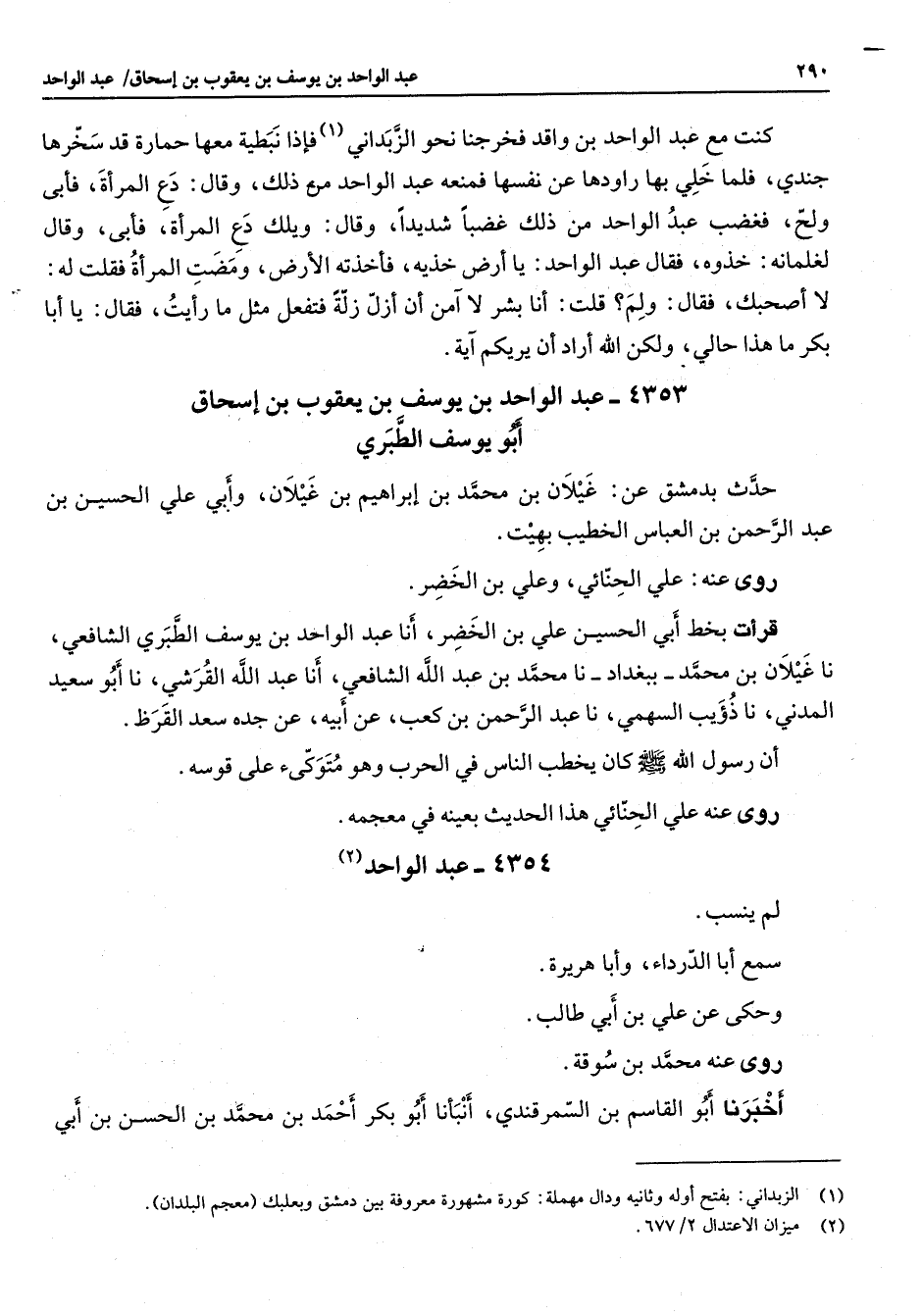 4354 - عبد الواحد (2) لم ينسب سمع أبا الدرداء وأبا هريرة وحكى عن علي بن أي طالب روى عنه محمد بن سوقة أخبرنا أبو القاسم بن السمرقندي أنبأنا أبو بكر أحمد بن محمد بن الحسن بن أبي