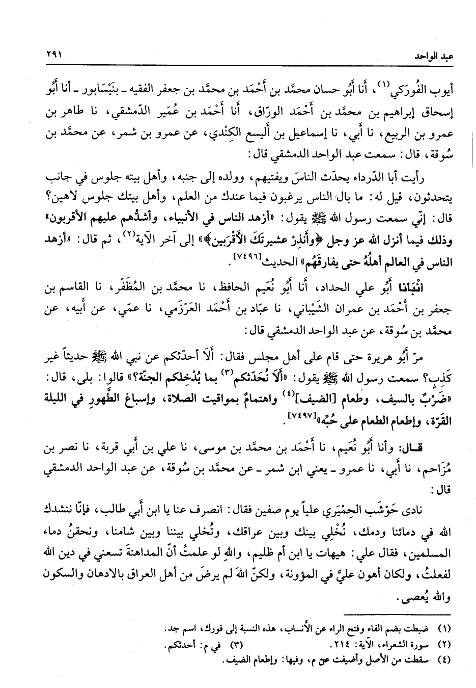 أيوب الفوركي (1) أنا أبو حسان محمد بن أحمد بن محمد بن جعفر الفقية بنيسابور أنا أبو إسحاق إبراهيم بن محمد بن أحمد الوراق أنا أحمد بن عمير الدمشقي نا طاهر بن عمرو بن الربيع نا أبي نا إسماعيل بن اليسع الكندي عن عمرو بن شمر عن محمد بن سوقة قال سمعت عبد الواحد الدمشقي قال رأيت أبا الدرداء يحدث الناس ويفتيهم وولده إلى جنبه وأهل بيته جلوس في جانب يتحدثون قيل له ما بال الناس يرغبون فيما عندك من العلم وأهل بيتك جلوسلأهين قال إني سمعت رسول الله (صلى الله عليه وسلم) يقول أزهد الناس في الأنبياء واشدهم عليهم الأقربون وذلك فيما أنزل الله عز وجل " وأنذر عشيرتك الأقربين " إلى آخر الآية (2) ثم قال أزهد الناس في العالم أهله حتى يفارقهم الحديث
