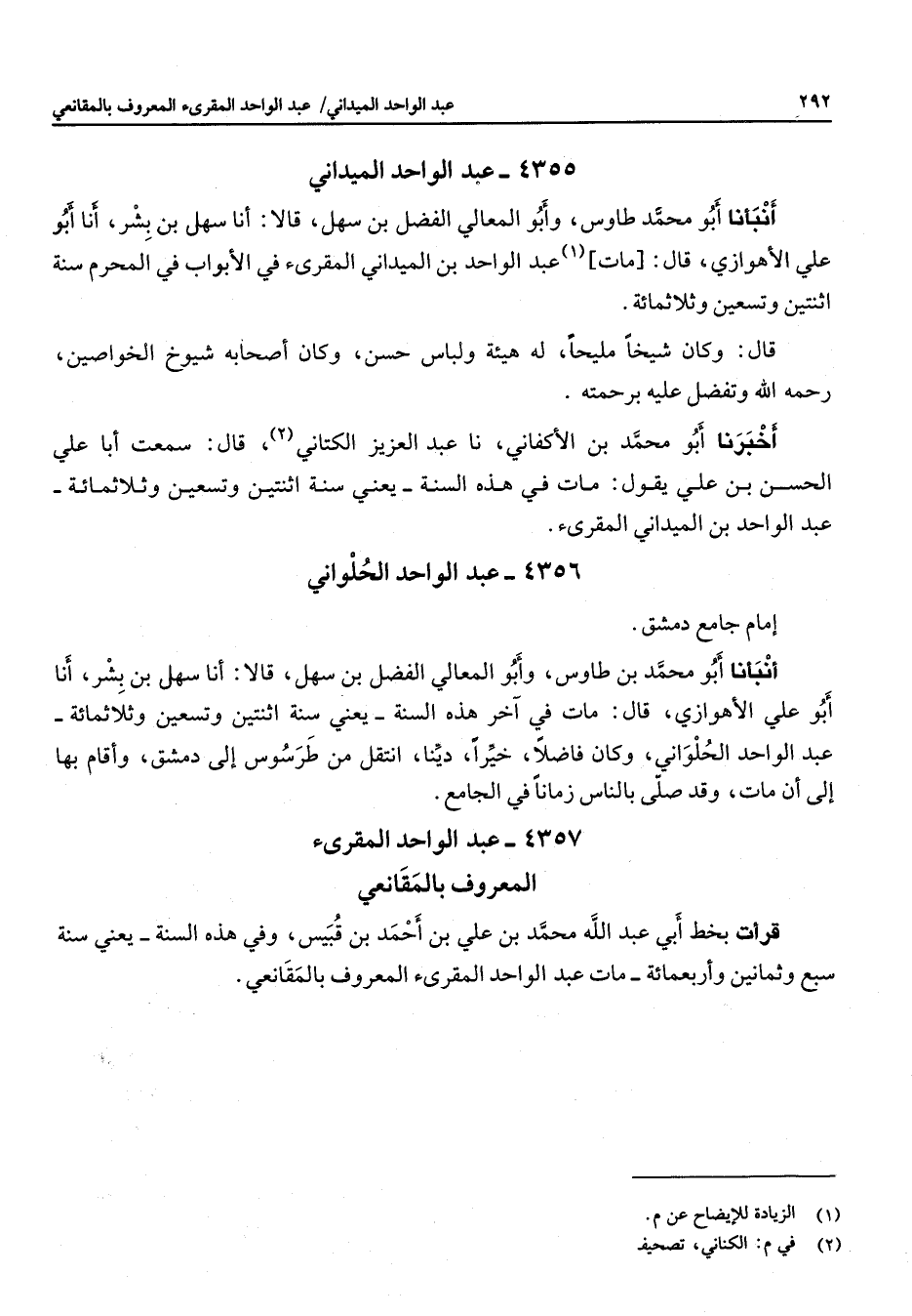 4356 - عبد الواحد الحلواني إمام جامع دمشق أنبأنا أبو محمد بن طاوس وأبو المعالي الفضل بن سهل قالا أنا سهل بن بشر أنا أبو علي الأهوازي قال مات في آخر هذه السنة يعني سنة اثنتين وتسعين وثلاثمائة عبد الواحد الحلواني وكان فاضلا خيرا دينا انتقل من طرسوس إلى دمشق وأقام بها إلى ت أن مات وقد صلى بالناس زمانا في الجامع 4357 عبد الواحد المقرئ المعروف بالمقانعي قرأت بخط ابي عبد الله محمد بن علي بن أحمد بن قبيس وفي هذه السنة يعني سنة سبع وثمانين وأربعمائة مات عبد الواحد المقرئ المعروف بالمقانعي
