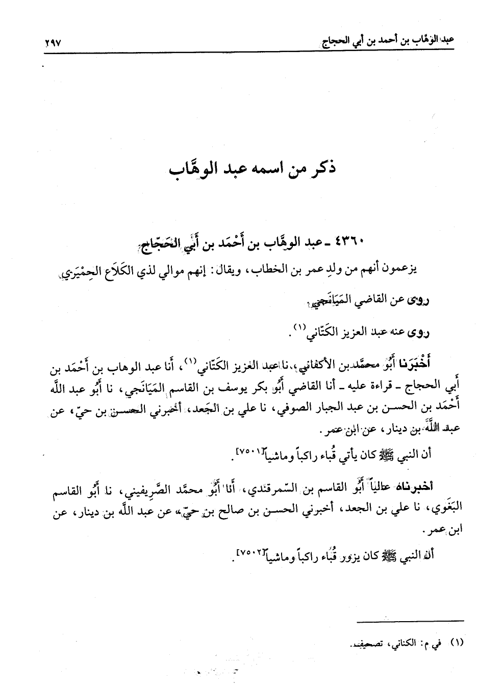 4360 - عبد الوهاب بن أحمد بن أبي الحجاج يزعمون أنهم من ولد عمر بن الخطاب ويقال إنهم موالى لذي الكلاع الحميري روى عن القاضي الميانجي روى عنه العزيز الكتاني (1) اخبرنا أبو محمد الأكفاني نا عبد العزيز الكتاني (1) أنا عبد الوهاب بن أحمد بن ابي الحجاج قراءة عليه أنا القاضي أبو بكر يوسف بن القاسم الميانجي نا أبو عبد الله أحمد بن الحسن بن عبد الجبار الصوفي نا علي بن الجعد أخبرني الحسن بن حي عن عبد الله بن دينار عن ابن عمر أن النبي (صلى الله عليه وسلم) ياتي قباء راكبا وماشيا