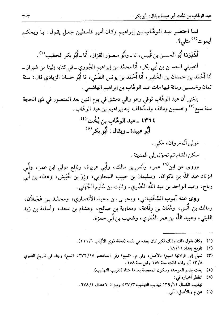 4364 - عبد الوهاب بن بخت (4) أبو عبيدة ويقال أبو بكر (5) مولى آل مروان مكي سكن الشام ثم تحول إلى المدينة وروى عن ابن (6) عمر وأنس بن مالك وأبي هريرة ونافع مولى ابن عمر وأبي الزناد عبد الله بن ذكوان وسليمان بن حبيب المحاربي وزر بن حبيش وعطاء بن أبي رباح وعبد الواحد بن عبد الله النصري وثابت بن سليم الجهني روى عنه أيوب السختياني ويحيى بن سعيد الأنصاري ومحمد بن عجلان ومالك بن أنس ومعان بن رفاعة ومعاوية بن صالح وهشام بن سعد وأسامة بن زيد الليثي وعبيد الله بن عمر العمري وشعيب بن أبي حمزة