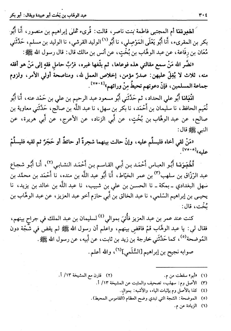 أخبرتنا أم المجتبى فاطمة بنت ناصر قالت قرئ على إبراهيم بن منصور أنا أبو بكر بن المقرئ أنا أبو يعلى الموصلي نا أبو (1) الوليد القرشي نا الوليد بن مسلم حدثني معان بن رفاعة عن عبد الوهاب بن بخت عن انس بن مالك قال قال رسول الله (صلى الله عليه وسلم) نضر الله من سمع مقالتي هذه فوعاها ثم بلغها غيره فرب حامل فقه إلى من هو أفقه منه ثلاث لا يغل عليهن صدر مؤمن إخلاص العمل لله ومناصحة اولي الأمر ولزوم جماعة المسلمين فإن دعوتهم تحيط من ورائهم [7504 أنبأنا أبو علي الحداد ثم حدثني أبو مسعود عبد الرحيم بن علي بن حمد عنه أنا أبو نعيم الحافظ نا سليمان بن أحمد نا بكر بن سهل نا عبد الله بن صالح حدثني معاوية بن صالح عن عبد الوهاب بن بخت عن ابي الزناد عن الأعرج عن أبي هريرة عن النبي (صلى الله عليه وسلم) قال من لقي أخاه فليسلم عليه وإن حلت بينهما شجرة أو حائط أو حجر ثم لقيه فليسلم عليه