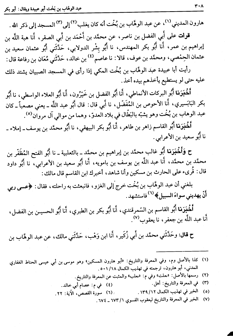 هارون المديني (1) عن عبد الوهاب بن بخت أنه كان يغلب (2) إلى (3) المسجد إلى ذكر الله قرأت علي أبي الفضل بن ناصر عن محمد بن أحمد بن أبي الصقر أنا هبة الله بن إبراهيم بن عمر أنا أبو بكر المهندس نا أبو بشر الدولابي حدثني أبو عثمان سعيد بن عثمان الحمصي ومحمد بن عوف قالا نا عاصم (4) بن خالد حدثني معان بن رفاعة قال رأيت أبا عبيدة عبد الوهاب بن بخت المكي إذ رأى في المسجد الصبيان يشتد ذلك عليه حتى لو يستطيع يأخذهم بيده أخذ أخبرنا أبو البركات الأنماطي أنا أبو الفضل بن خيرون أنا أبو العلاء الواسطي نا أبو بكر البابسيري أنا الأحوص بن المفضل نا ابي قال قال أبو عبد الله يعني مصعبا كان عبد الوهاب بن بخت وهو يشبه بالبطال في بلاد العدو وهما من موالي آل مروان (5) أخبرنا أبو القاسم زاهر بن طاهر أنا أبو بكر البيهقي نا أبو محمد بن يوسف إملاء نا أبو سعيد الأعرابي ح وأخبرنا أبو غالب محمد بن إبراهيم بن محمد بالثعلبية نا أبو الفتح المظفر بن محمد بن محمد أنا عبد الله بن يوسف بن بامويه أنا أبو سعيد بن الأعرابي نا أبو داود قال قرئ على الحارث بن مسكين وأنا شاهد اخبرك ابن القاسم قال مالك بلغني أن عبد الوهاب بن بخت خرج إلى الغزو فانبعثت به راحلته فقال " عسى ربي أن يهديني سواء السبيل " (6) فاستشهد اخبرنا أبو القاسم بن السمرقندي أنا أبو بكر بن الطبري أنا أبو الحسين بن الفضل أنا عبد الله بن جعفر نا يعقوب (7) ح قال وحدثني محمد بن ابي زكير أنا ابن وهب حدثني مالك عن عبد الوهاب بن