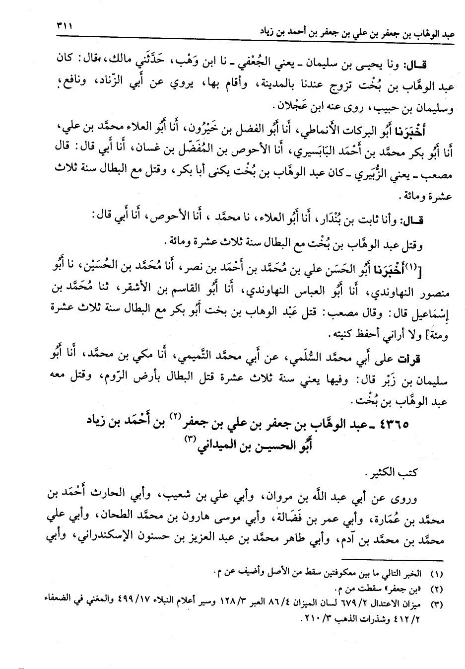 4365 - عبد الوهاب بن جعفر بن علي بن جعفر (2) بن أحمد بن زياد أبو الحسين بن الميداني (3) كتب الكثير وروى عن أبي عبد الله بن مروان وأبي علي بن شعيب وأبي الحارث أحمد بن محمد بن عمارة وأبي عمر بن فضالة وأبي موسى هارون بن محمد الطحان وأبي علي محمد بن محمد بن آدم وابي طاهر محمد بن عبد العزيز بن حسنون الإسكندراني وأبي